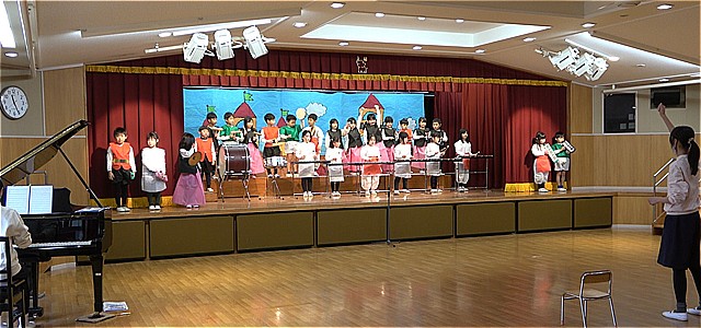 舞台下で全員でオープニングの歌を歌います。舞台下の並び方は、左側から出演順です。詳しくはクラスだよりを参照してください。