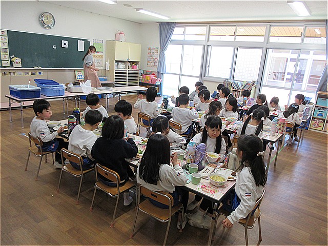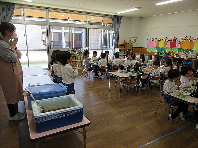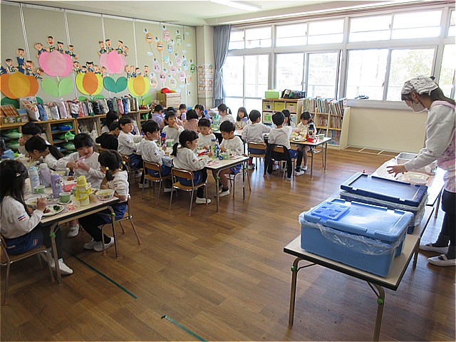 11日(水)は、幼稚園父母の会の皆様ご厚意により、特別メニューとして幼稚園給食に「いちごクレープ」を提供していただきました。子どもたちは大喜びでした。年長組さんの皆さん、小学校でも給食をいっぱい食べてね。
