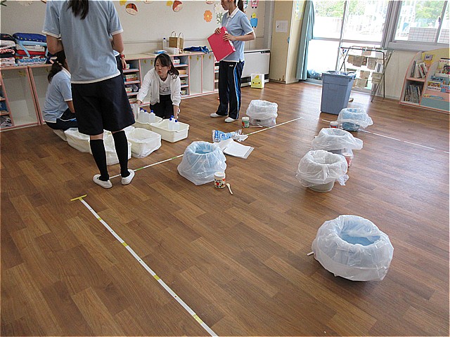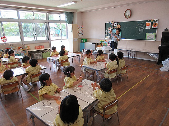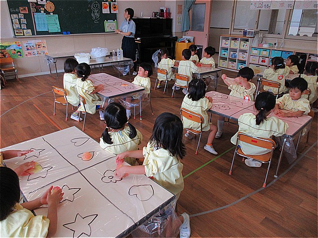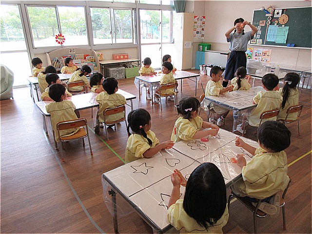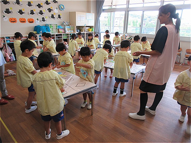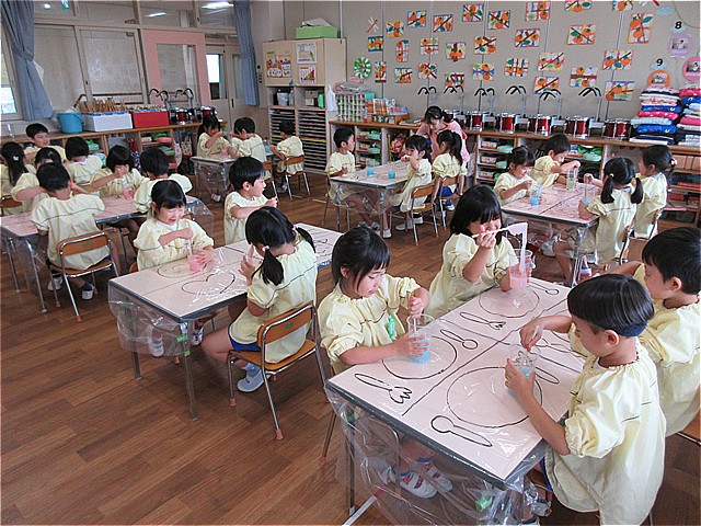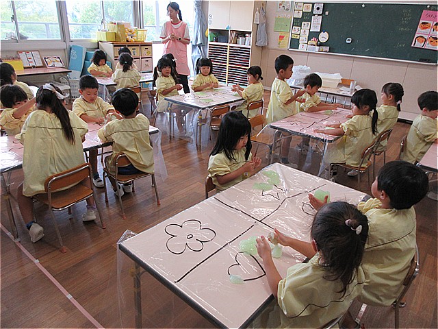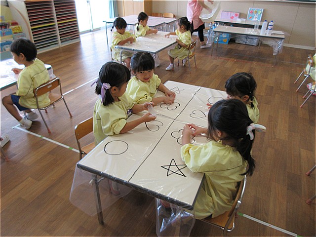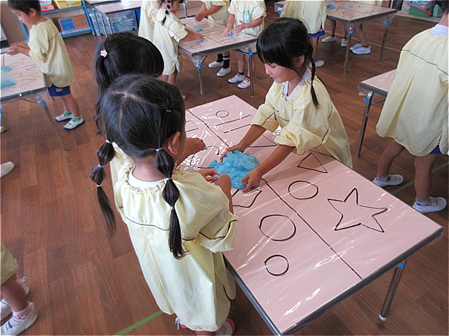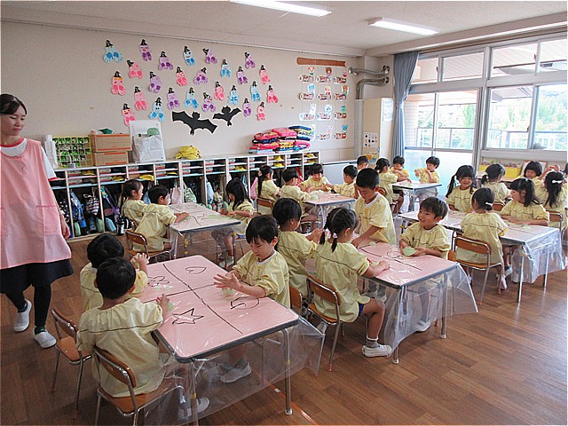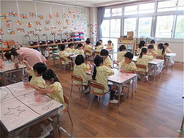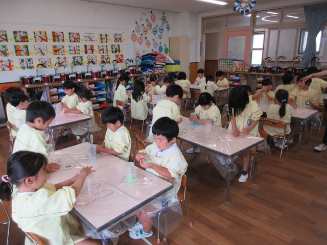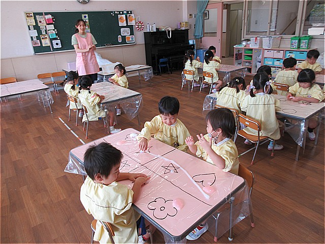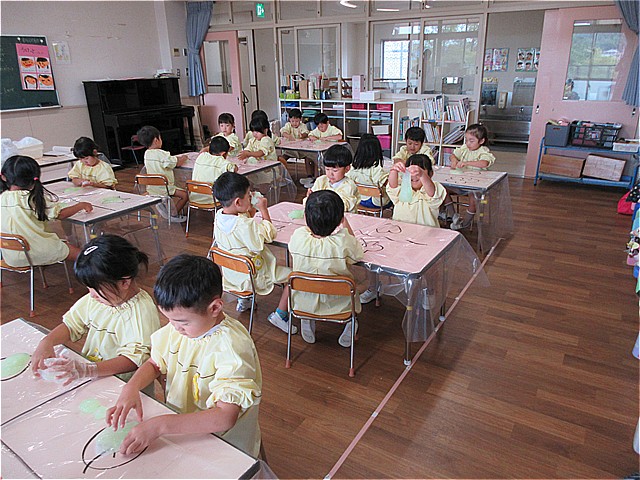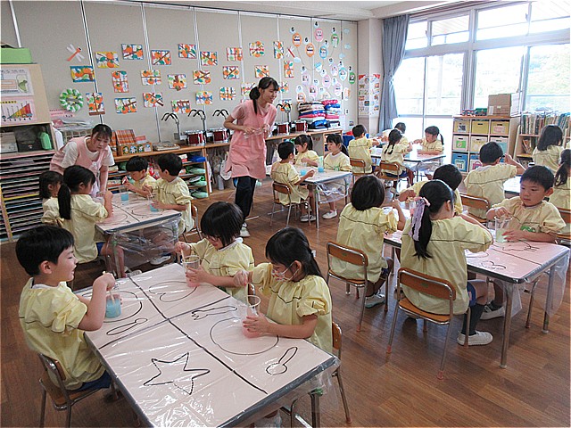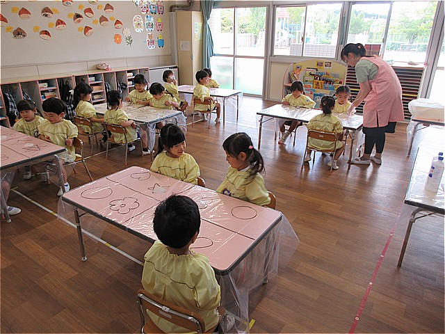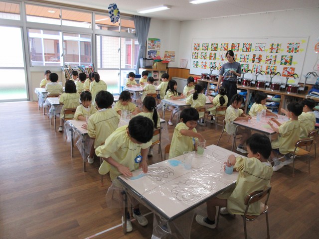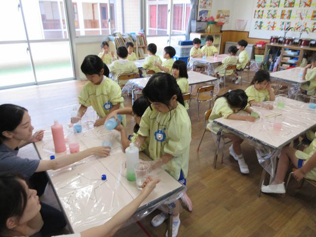 今回のわくわくデーは、「スライム遊び」を楽しみました。年少、年中組は先生が実演をしてスライムを作り、年長組は、自分たちでスライムを作りました。前日に先生たちで机にビニールをかぶせ、かわいらしい絵を描いて、準備をしました。美山っ子たちは、素敵な発想で、様々な形にしてスライム遊びを楽しみました。