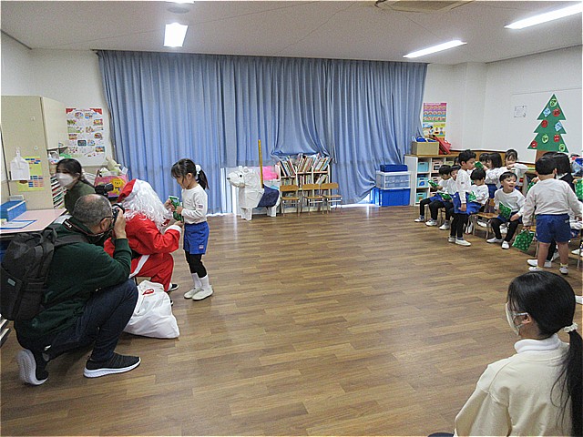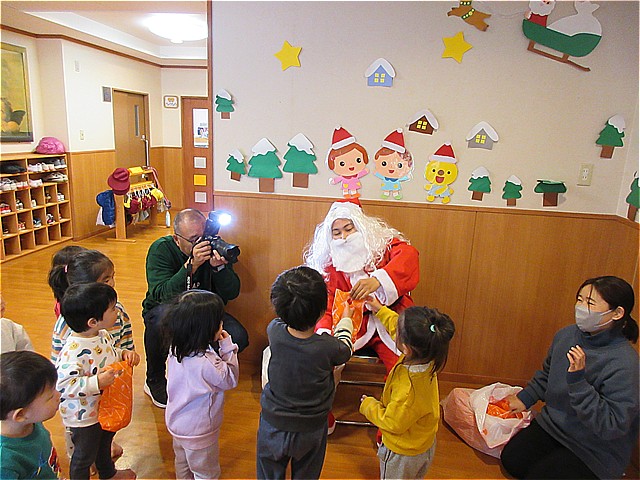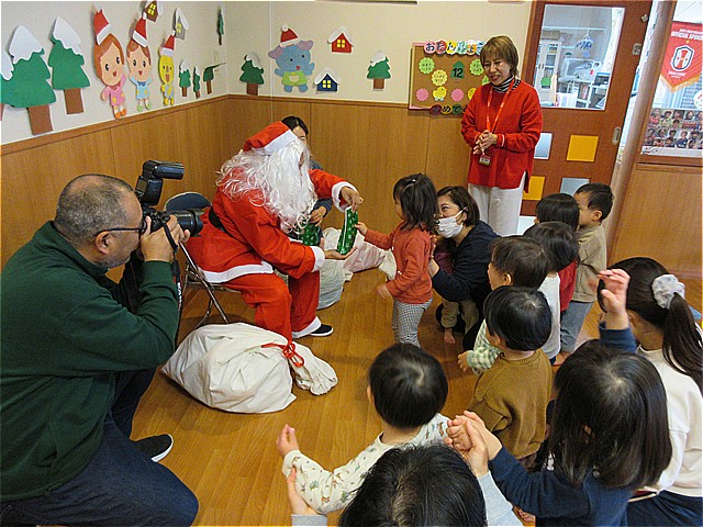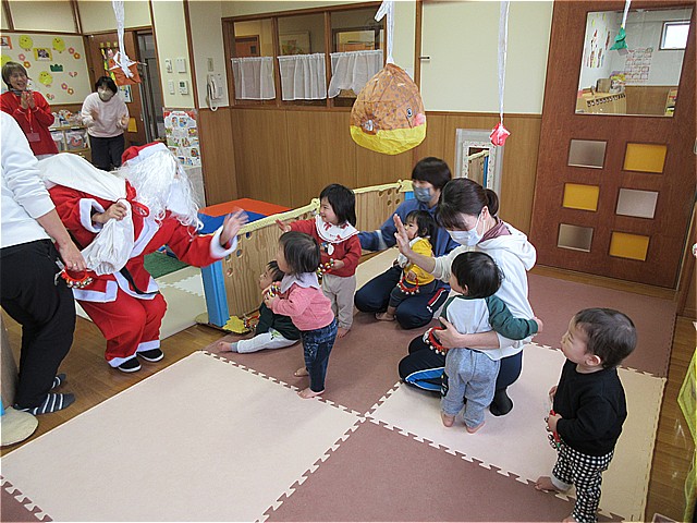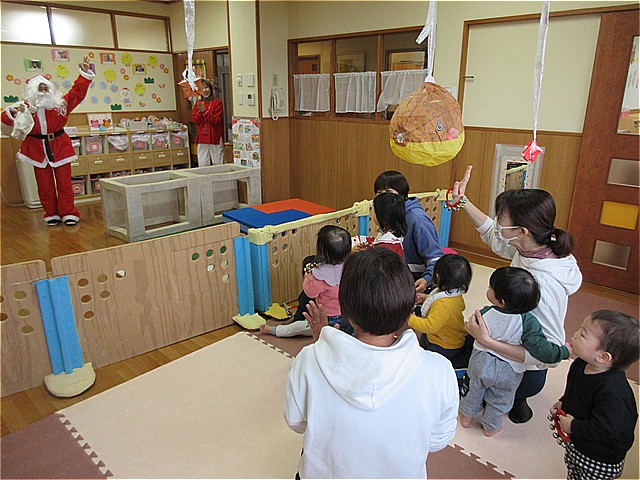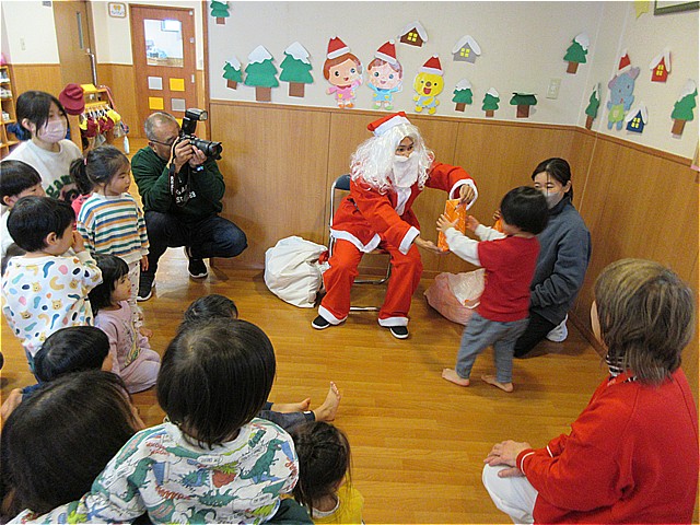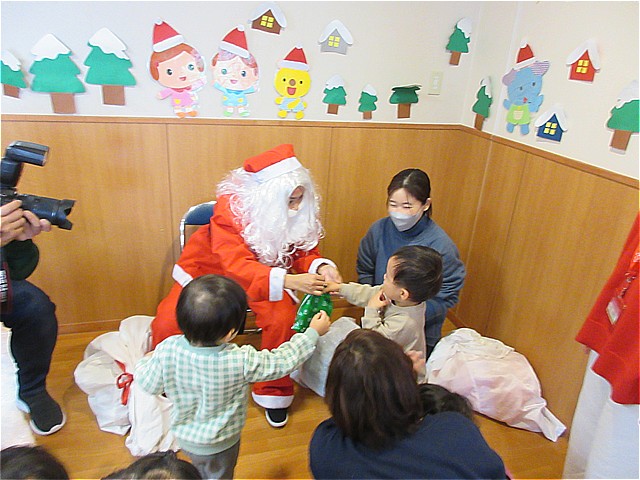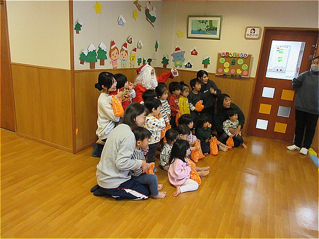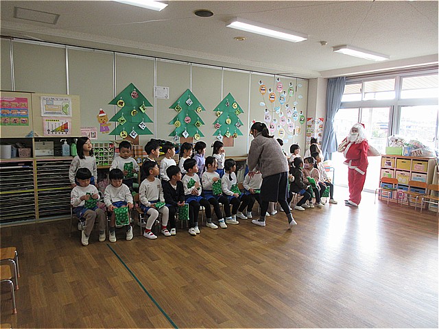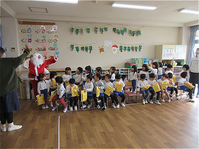 クリスマス会の後にサンタさんが、各保育室にプレゼントを配りに来てくれました
