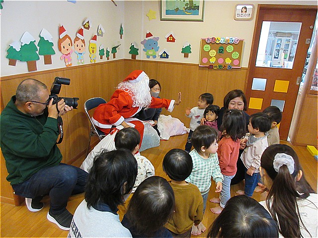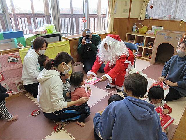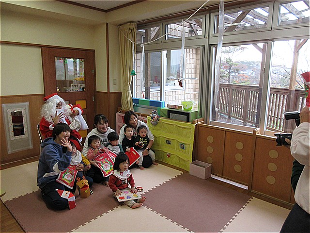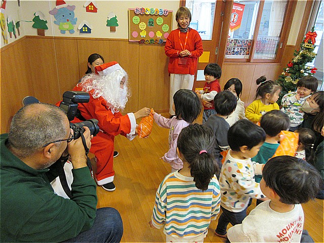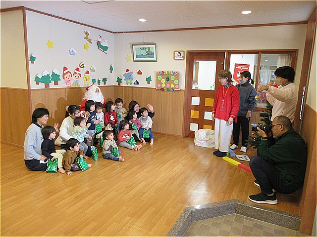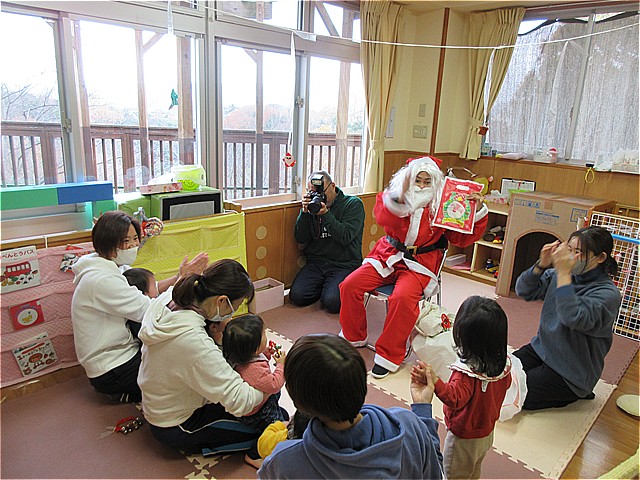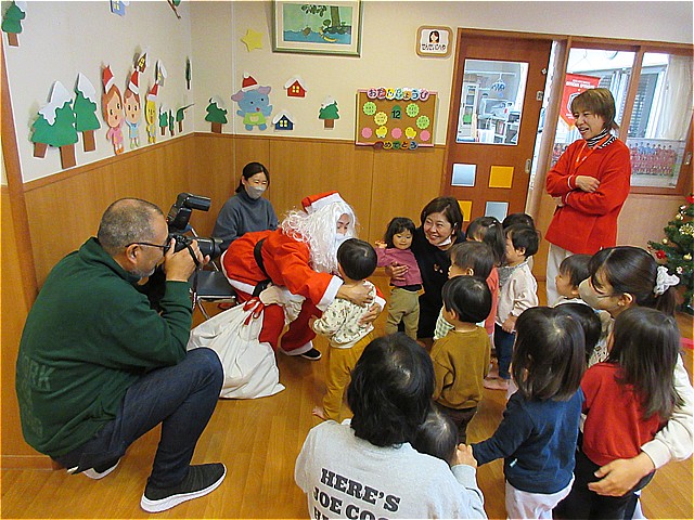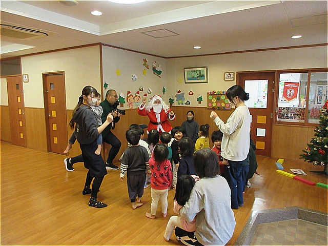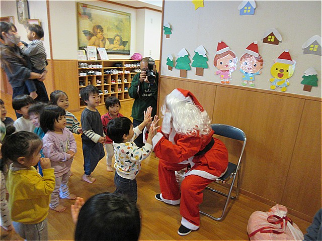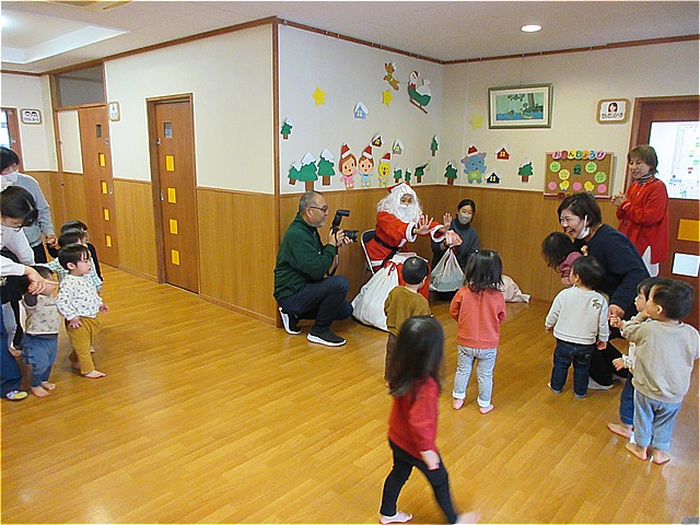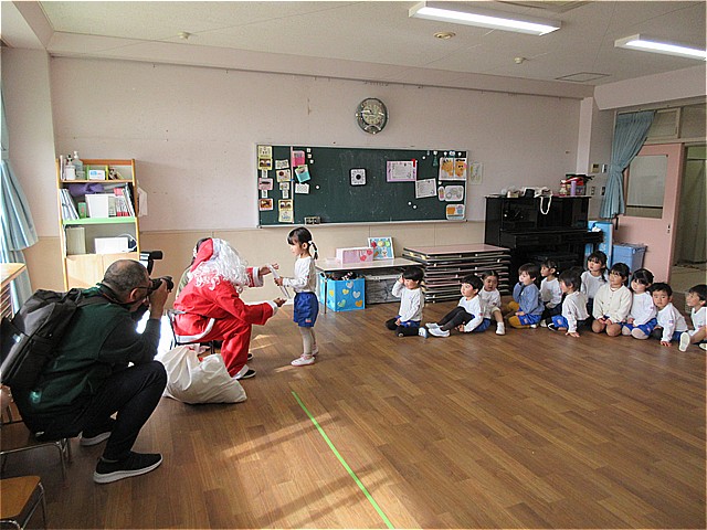 クリスマス会の後にサンタさんが、各保育室にプレゼントを配りに来てくれました