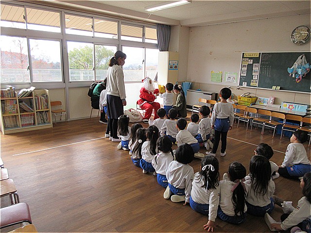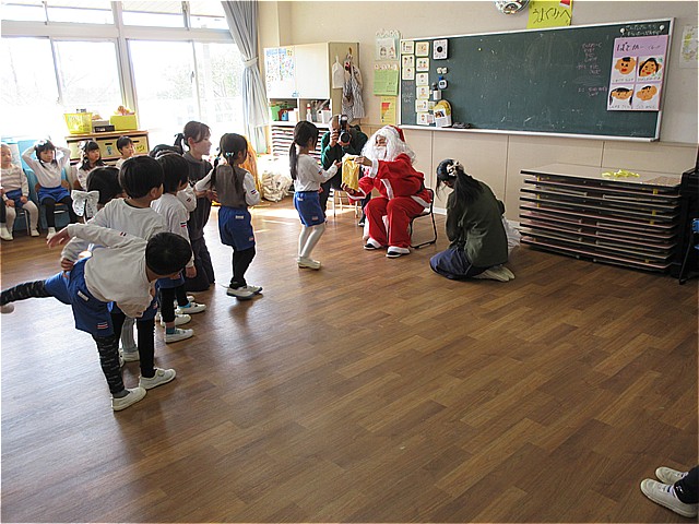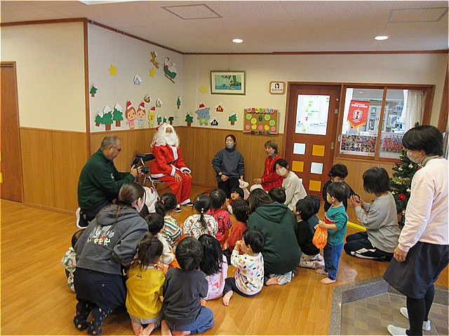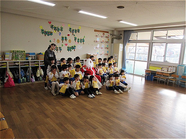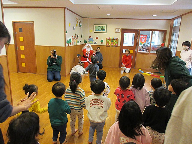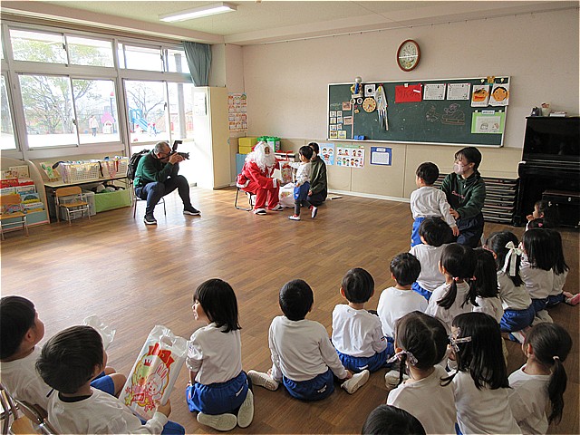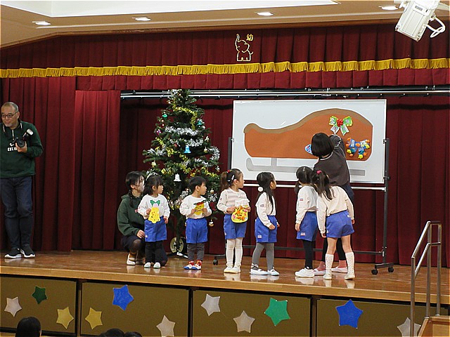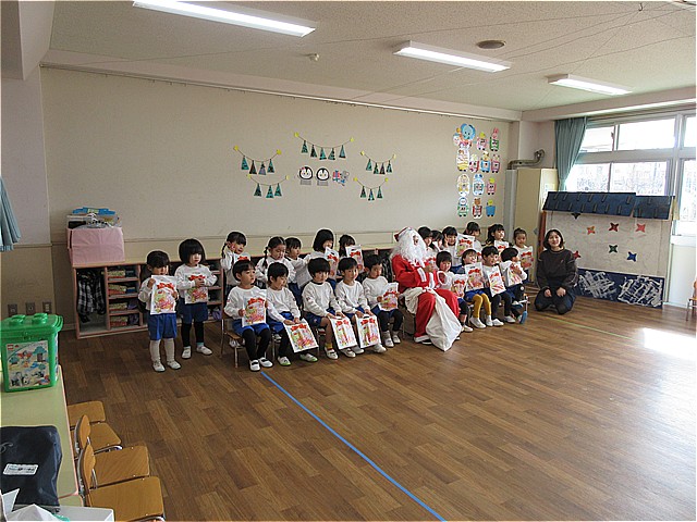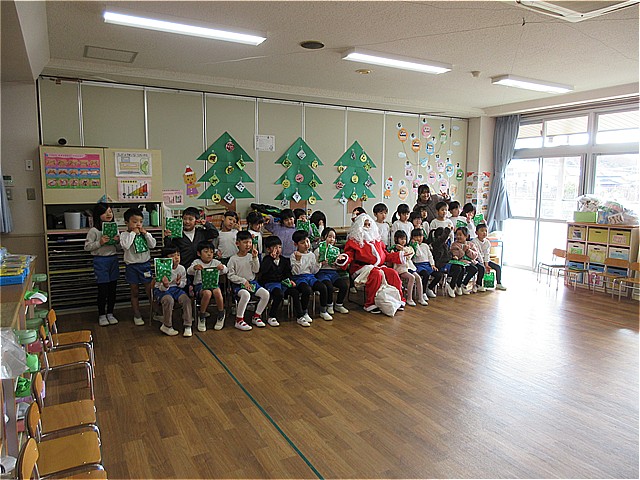 16日(月)は美山こども園のクリスマス会でした。保育園では、てんとうむし組は保育室で、ちょうちょう組と かぶとむし組は保育園玄関アプローチでサンタさんからプレゼントをもらいました。幼稚園では、遊戯室に集まり 先生たちの演奏と、大型紙芝居「ねむいねむい ねずみのクリスマス」のプレゼントがありました。「あわてんぼうのサンタクロース」を踊りながら歌い、サンタさんが迷わず美山こども園に来ることができるように、そりの絵に飾り付けをして、到着を待ちました。サンタさんを待っていると・・・本当にサンタさんがやってきました。サンタさんにインタビューをした後に各保育室でサンタさんからプレゼントをもらい、記念写真を撮りました。プレゼントは何だったかな? 幼稚園の給食には父母の会の皆様のご厚意で「クリスマスデザートのイチゴ味のカップケーキ」が出ました。今日はスペシャルなとっても楽しい一日でした。