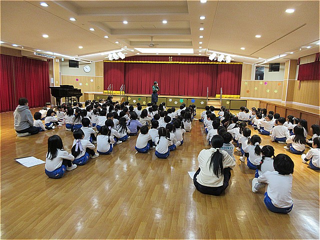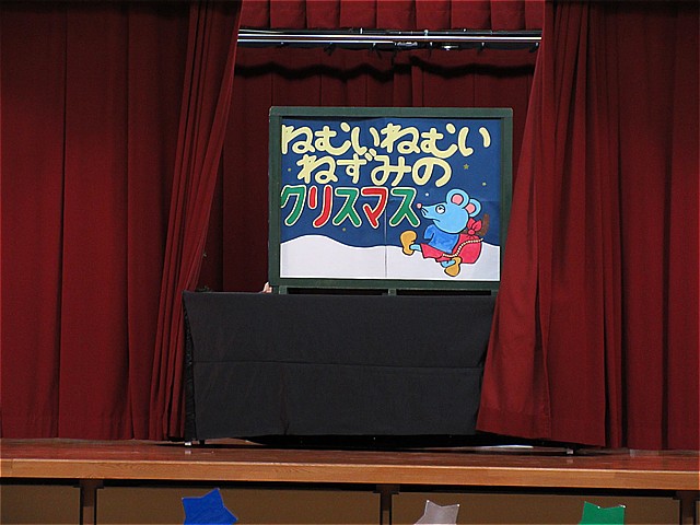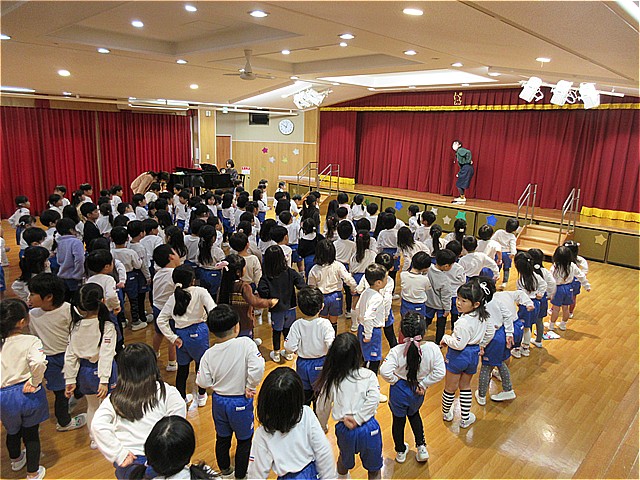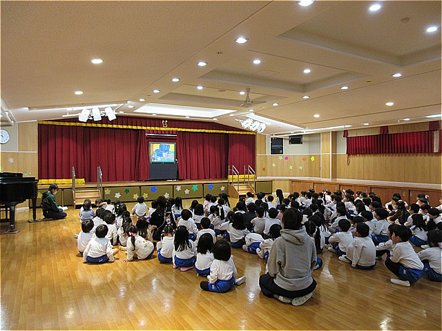 クリスマス会が始まりました。先生の演奏「赤鼻のトナカイ」と大型紙芝居「「ねむいねむい ねずみのクリスマス」です