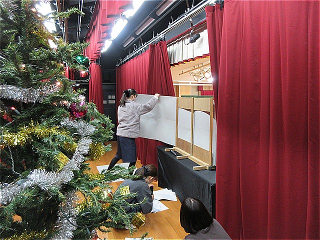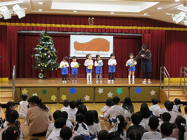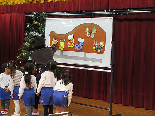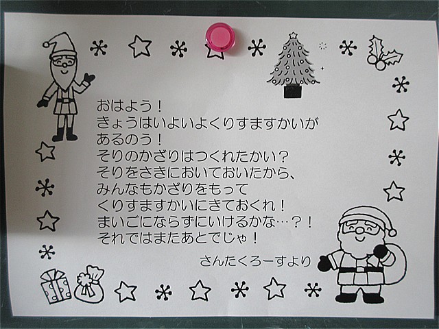 クラス代表のお友だちが舞台に上がり、各クラスで作った飾りを そりに貼り付けました。クラスには朝にサンタさんからの手紙が届いていました。