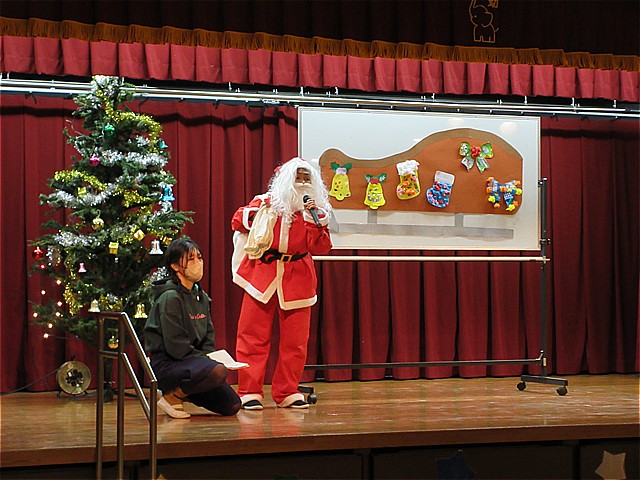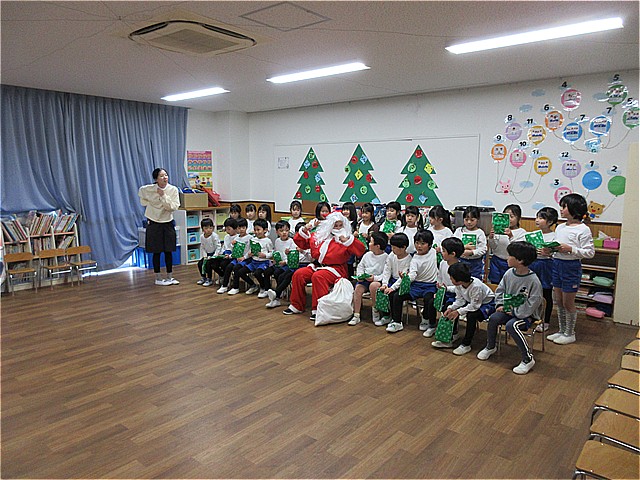 鈴の音が聞こえてきて遊戯室が暗くなったら・・・サンタさんが現れました!!!クラス代表のお友だちが、サンタさんに質問をしたら英語で答えてくれました