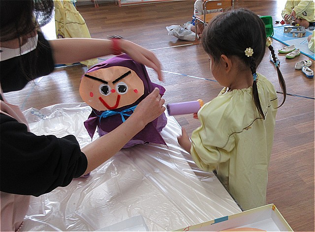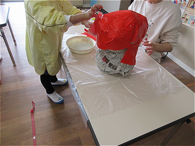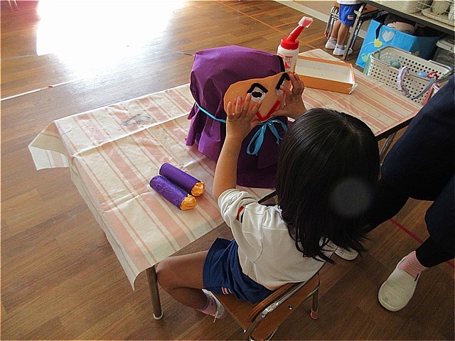 クラスごとに決められた胴体色の折り紙を貼り付けます
