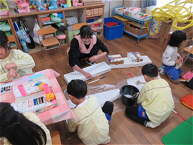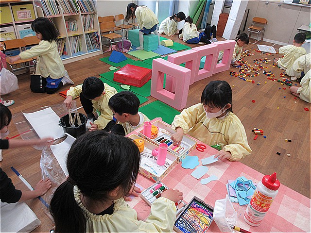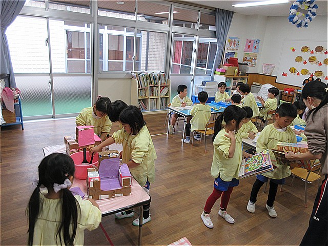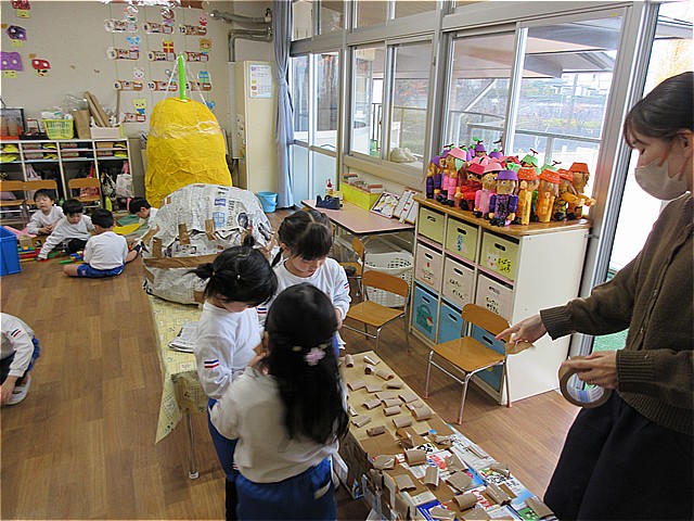 年長組は2クラス合同で、遊戯室に大きな遊園地を作っていきます。