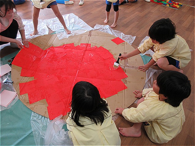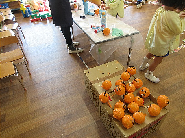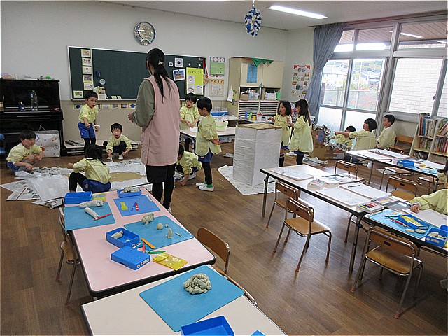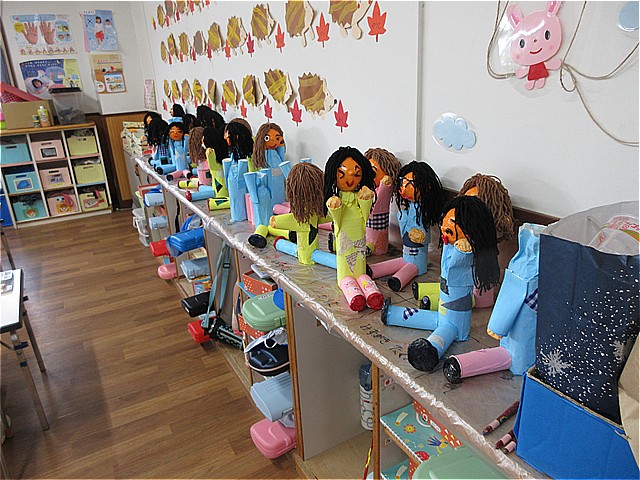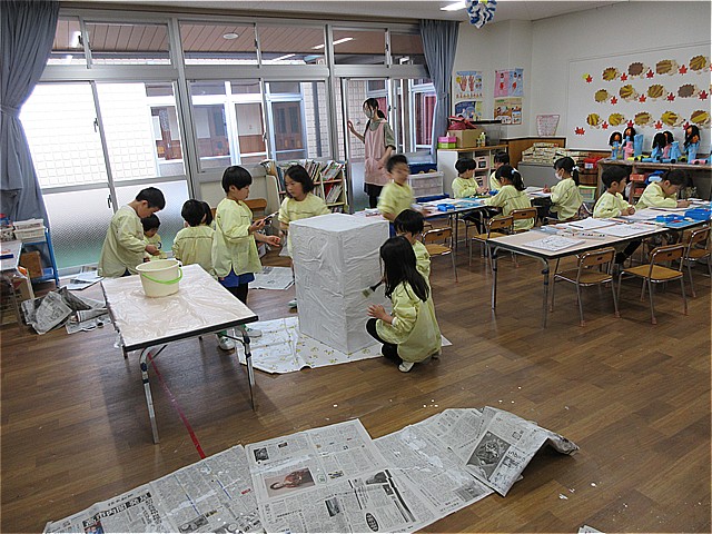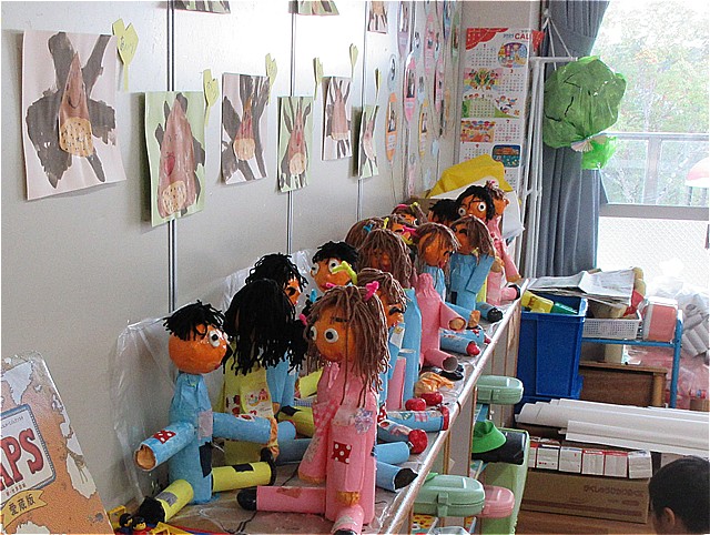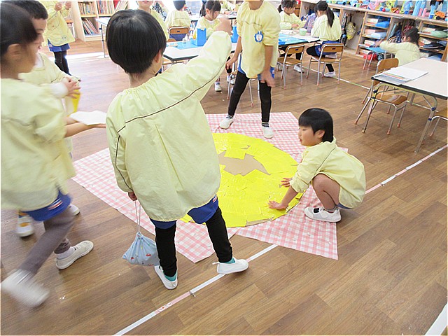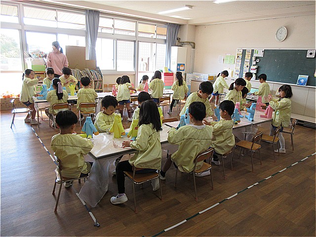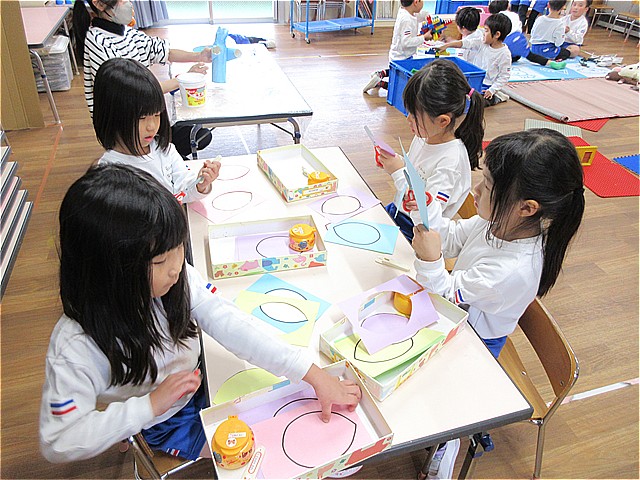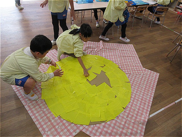 共同制作は学年テーマに合わせ 各クラス独自の作品を作ります。今回は制作の様子をお伝えします。年長組のテーマは「みやまゆうえんちへ ようこそ!!」です。個人作品は、参観日に取り組んだ「遊園地に行った自分」人形を作りました。共同制作と補助制作は各クラスで学年テーマに合わせた作品を作っています。詳しくは各クラスのクラス便りをご覧ください。