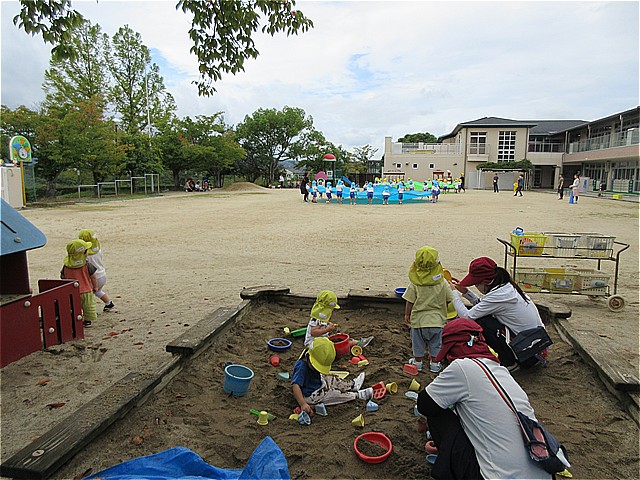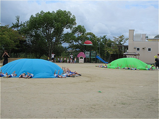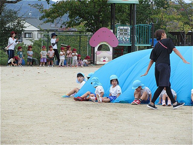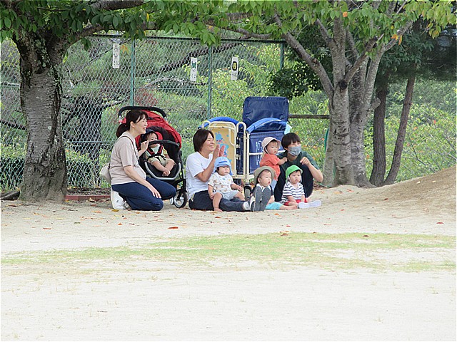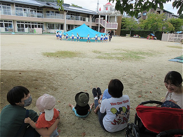 美山こども園は、0才(月齢6か月から)から小学校入学前までの幅広い年齢の子どもが在籍しています。今日は、年中組のパラバルーンの練習の様子を保育園のみんなで見学しました。保育園に在籍しながら、幼稚園の活動に触れることができることも、こども園の大きなメリットです。手をパチパチたたいて、応援してくれていました。