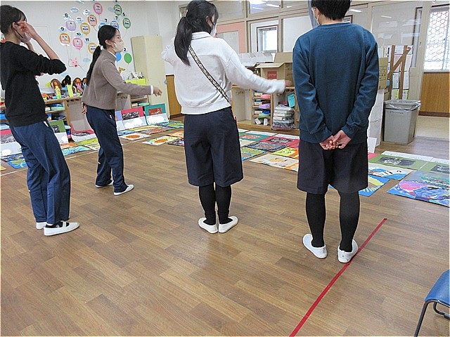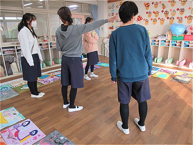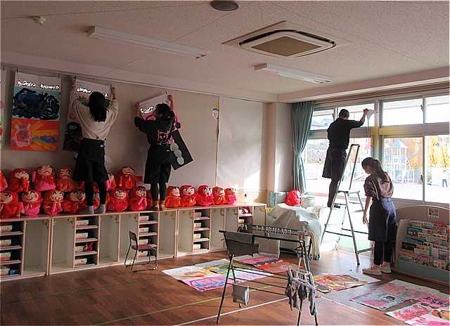園児が降園後、絵画をどのようにバランスよく展示するかを検討確認し、全クラス教職員で協力して絵画を展示しました。
