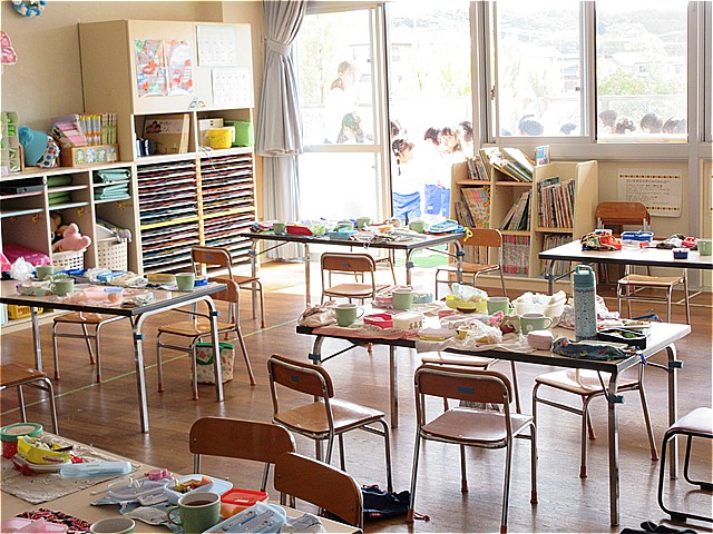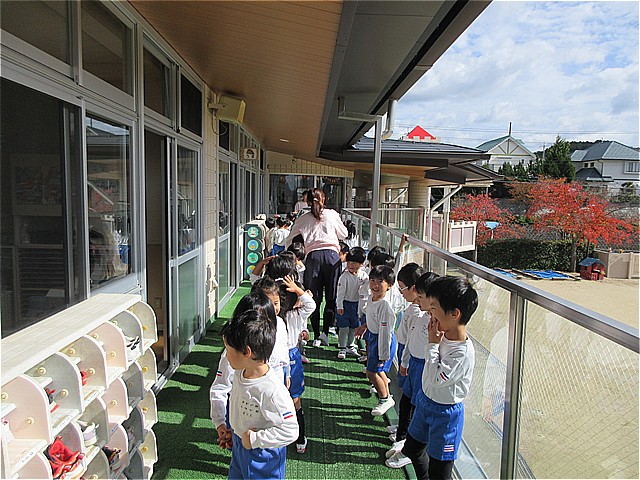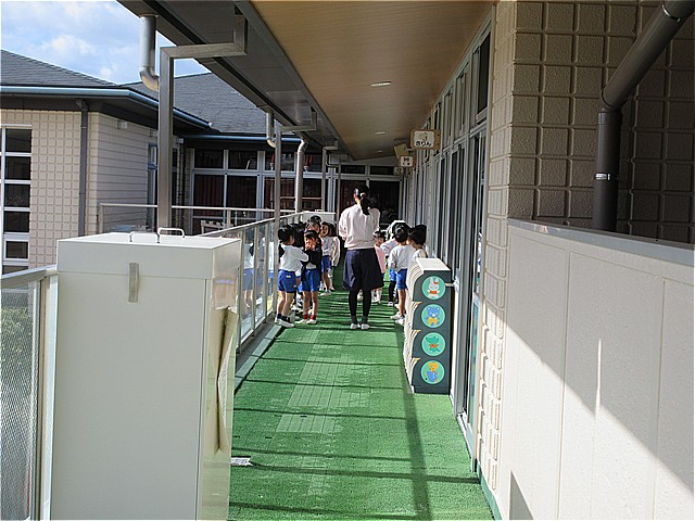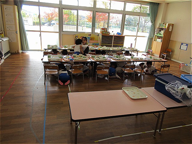 今回は昼食時間中に地震が起きたことを想定した避難訓練です。今回は食事中のため、机の下に隠れ、テラス又は廊下まで避難する(本来は園庭まで)訓練を行いました。