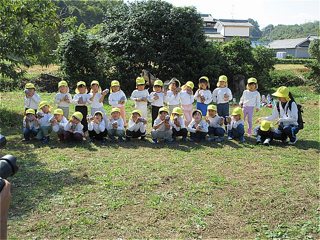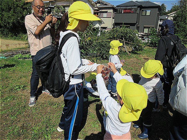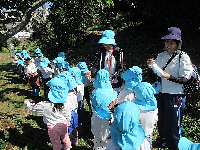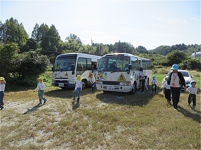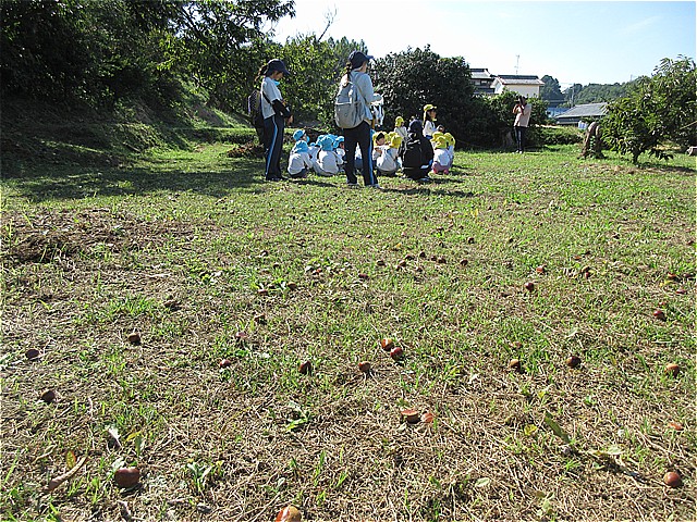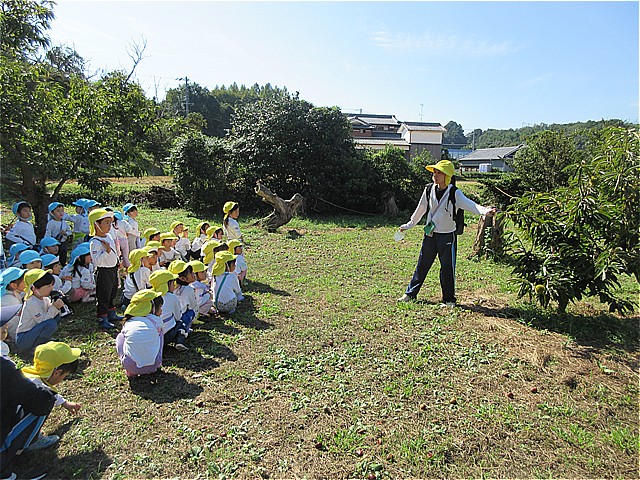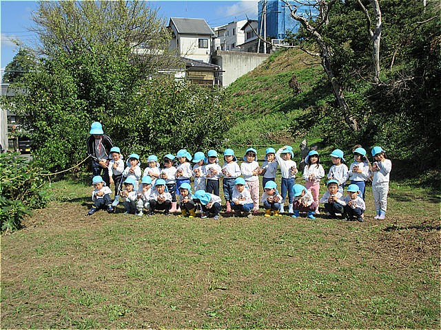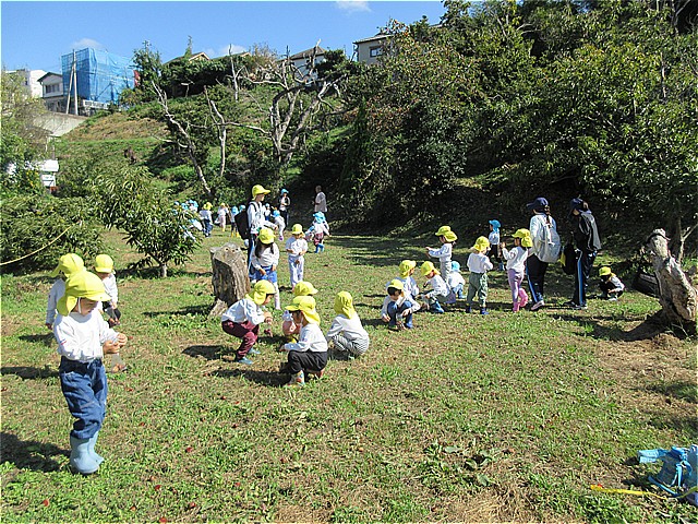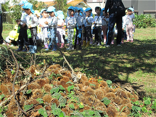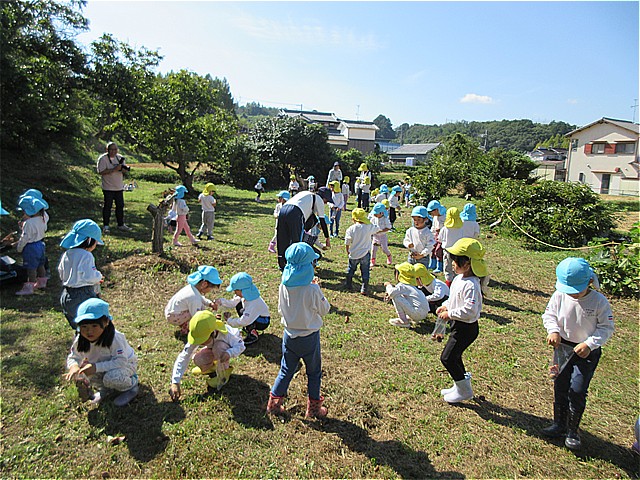 秋晴れの10月7日に、いつもお世話になっている東畦野の植田農園さんに栗拾いに行ってきました。農園の方に前もってイガを剥いた栗をまいてもらい、イガのついていない栗を拾いました。袋いっぱいに栗を拾った後は、こども園に帰ってお弁当とおやつタイムです。気温が上がり暑くなったので、お弁当は遊戯室で食べました。今日はビニール袋いっぱいの栗がお土産です。