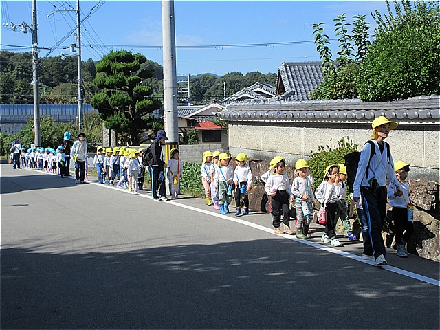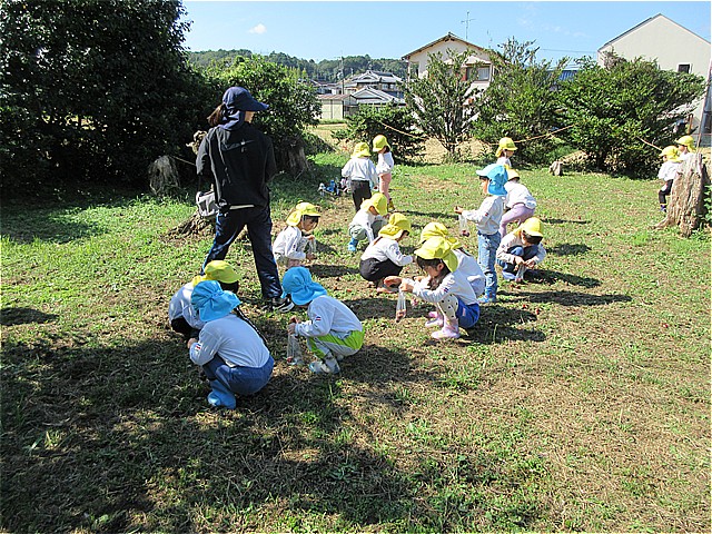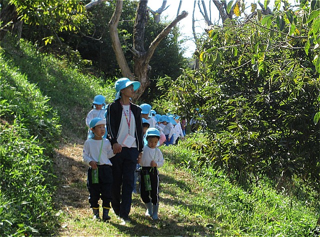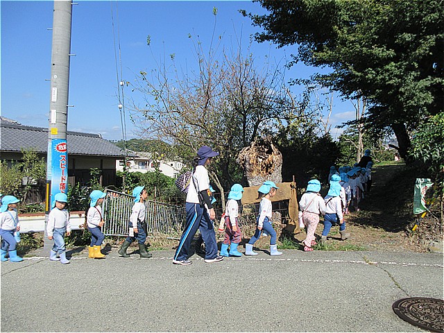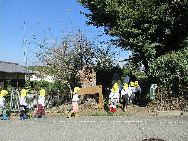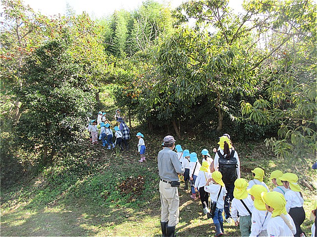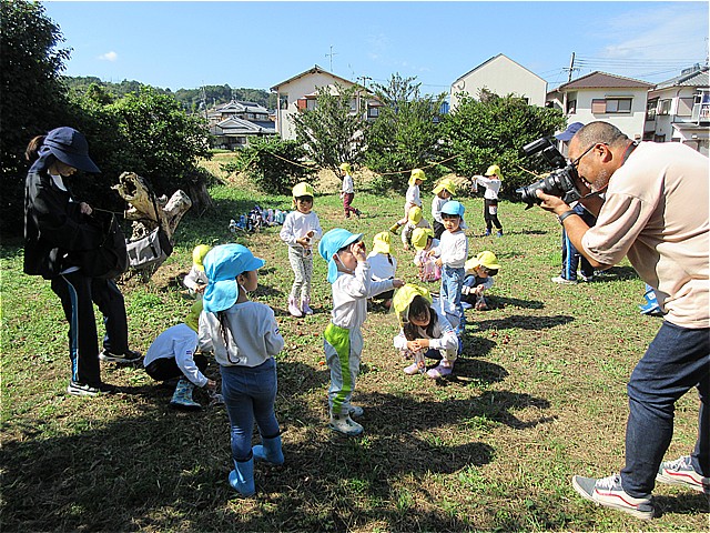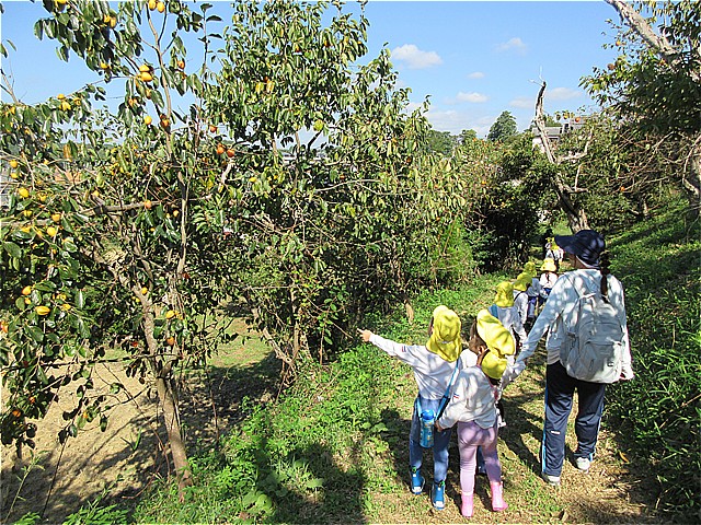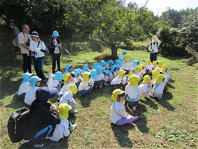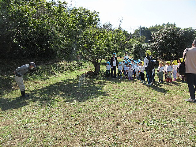 秋晴れの10月7日に、いつもお世話になっている東畦野の植田農園さんに栗拾いに行ってきました。農園の方に前もってイガを剥いた栗をまいてもらい、イガのついていない栗を拾いました。袋いっぱいに栗を拾った後は、こども園に帰ってお弁当とおやつタイムです。気温が上がり暑くなったので、お弁当は遊戯室で食べました。今日はビニール袋いっぱいの栗がお土産です。