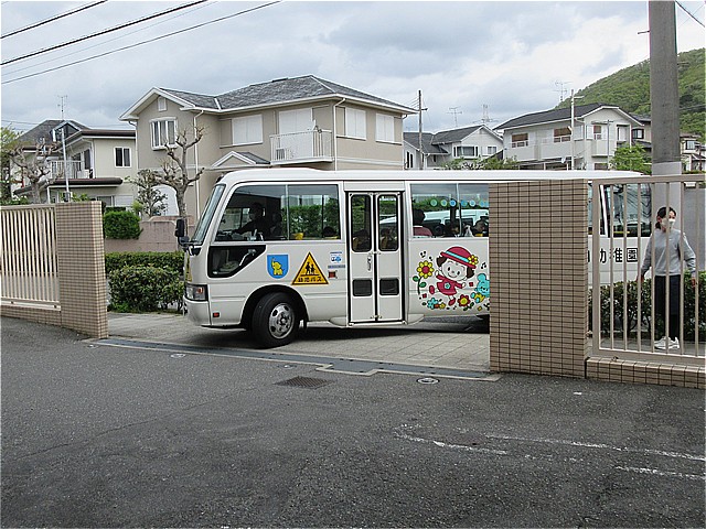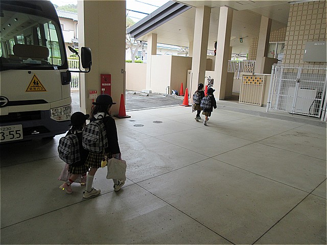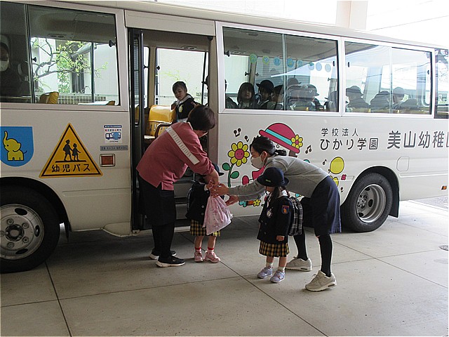 バスで通園の美山っ子が到着です