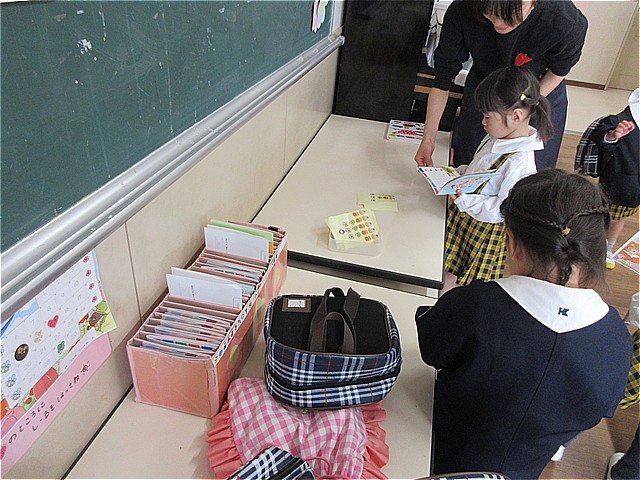 お帳面にシールを貼り、かばんをかけたら、椅子に座って絵本を見る時間です。