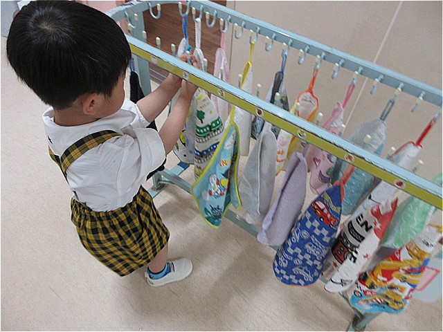 お部屋に入ると上着や帽子をハンガーにかけます