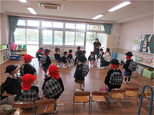 年少組のみんなは、年中、年長組のお兄さん、お姉さんと手をつないで保育室まで歩いていきます。