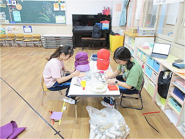 子どもたちが降園後、年少組の先生は、作品展の準備を頑張っていました。子どもたちの笑顔のために頑張っています。