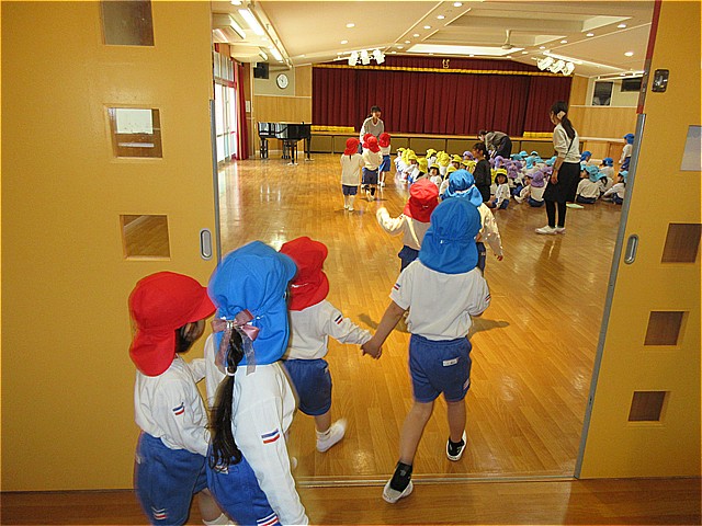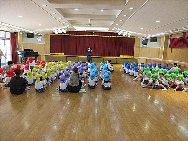 美山幼稚園に入園したお友だちの歓迎会を行いました。年長組のみんなが、年少組までお迎えに行き、手をつないで遊戯室まで案内しました。先生との手遊び、園長先生のお話、年長組からの歓迎の言葉と歌のプレゼント「園歌の1番」、先生からの出し物と続き、最後は4月の歌「ぶんぶんぶん」を全員で歌って締めくくりました。