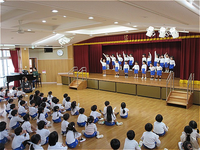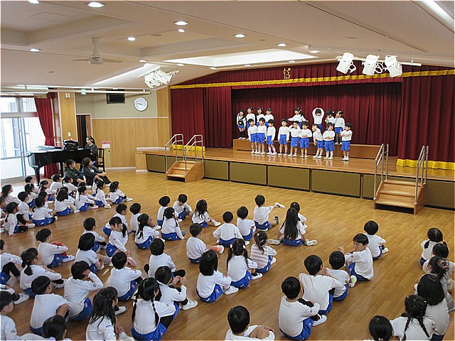 11月7日(金)に「朝のあつまり」を実施しました。年少組さんが合唱の発表をしました。1年間で全クラスが順番に合唱を発表していきます。大きな声でしっかり歌うことができました。
