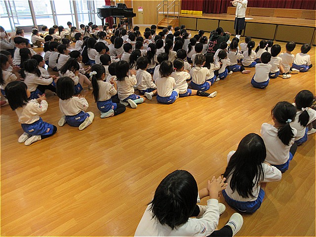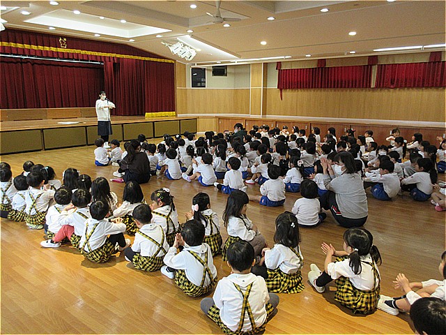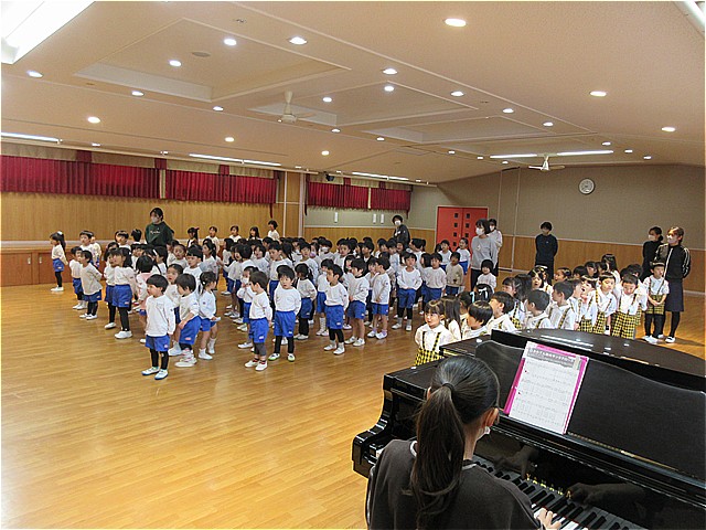 12月1日(月)に「朝のあつまり」を実施しました。年中組のやぎ組さんが合唱の発表をしました。1年間で全クラスが順番に合唱を発表していきます。大きな声でしっかり歌うことができました。
