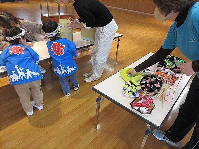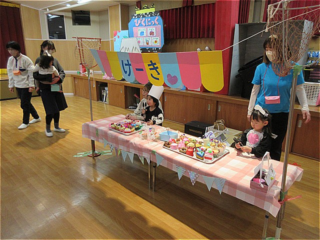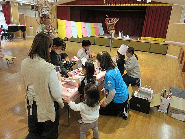 幼稚園に入園する前のこどもたちがリズム遊びや創作活動を通して、同年齢のお友だちと仲良く過ごし、親子が交流することを目的として開催しているパンダ教室ですが、今回は「お店屋さん遊び」を楽しみました。「おすしやさん」や「けーきやさん」の店員さんになって たくさんの品物をお客さんに買ってもらいました。次年度の募集も行っていますので、(下記参照)興味のある方は園までお問い合わせください。