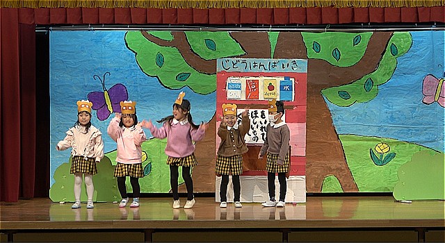 ぽんた(左側階段から登場)舞台袖でナレーションをしてから舞台に移動します。葉っぱを色々なものに代えることができる力を使って、葉っぱから自動販売機を作りました。自動販売機を作る動きや 歌とダンスをお楽しみください。