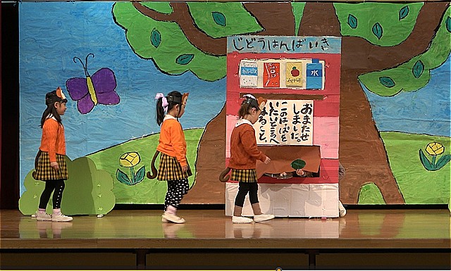 (左側階段からきつね・右側階段からぽんたが登場)両舞台袖でナレーションをしてから舞台に移動します。きつねが「おそろいの首飾りをちょうだいな!」と言って自動販売機に葉っぱを入れて、ぽんたが呪文を唱えると・・・