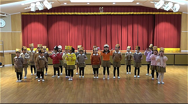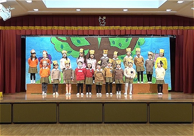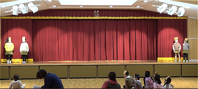 今回は年中の「うま組」さんの紹介です。18(水)発行予定のクラスだよりで劇のあらすじ、登場順等詳しく説明しますので参照してください。お子様に舞台での位置や、登場場面を確認しておいてください。HPでの使用写真は全クラス予行の様子を写したものです。欠席の場合は写っていません。また代役で演じている場合もあります。