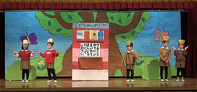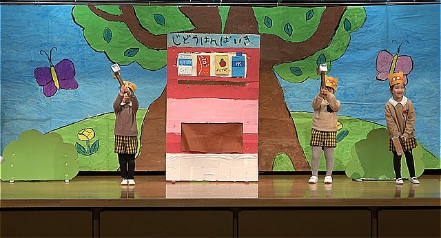 (左側階段からぽんこ・右側階段からぽんたが登場)舞台両端でナレーションをしてから劇が始まります。ぽんこはお友だちがいません。お友だちが欲しくて葉っぱを自動販売機に入れました。