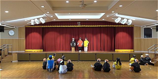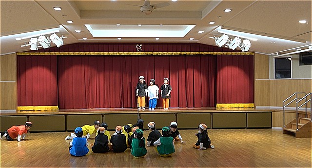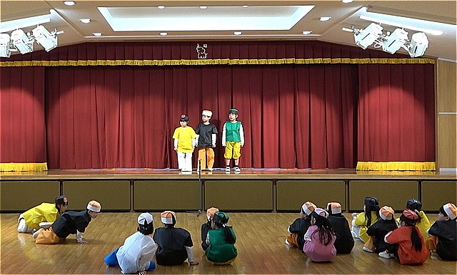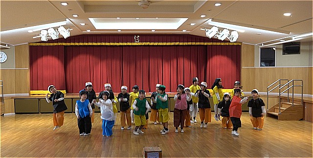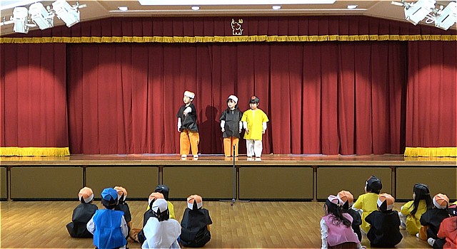 保護者の皆様が鑑賞されるときの参考になるよう舞台での場面を紹介します。今回は年長さんのらいおん組です。18日(水)発行のクラスだよりで劇のあらすじ、登場順等詳しく説明していますので参照してください。お子様に舞台での位置や、登場場面を確認しておいてください。HPでの使用写真は全クラス予行の様子を写したものです。欠席の場合は写っていません。また代役で演じている場合もあります。幼稚園最後の生活発表会、保護者の皆様の来園をお待ちしています。