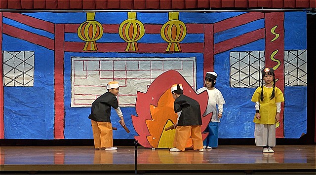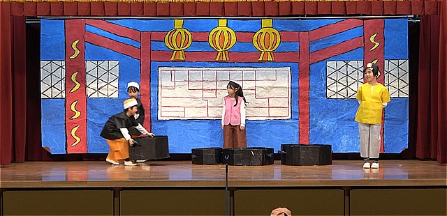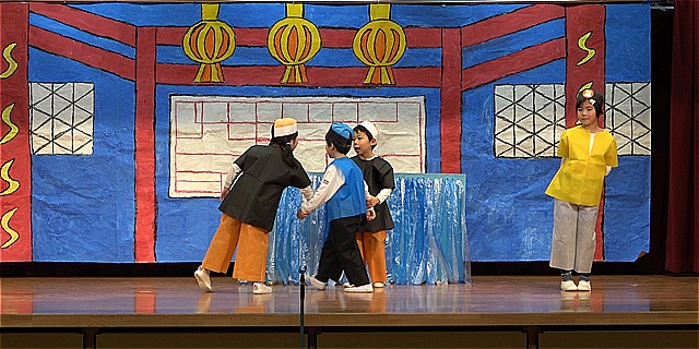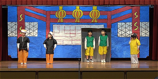9人兄弟の中から「食いしん坊」が宮殿に来ました。舞台に最初から王様、食いしん坊、家来が登場。食べ物を食べて見せました。王様は家来に宮殿にある食べ物を全部持ってくるように言いました。それも全部食べてしまいました