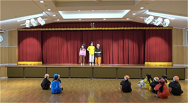 舞台下で、劇の終わりの説明をしてから舞台に上がり、「ありがとうの歌」を歌います