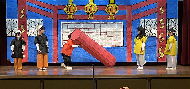 王様の宮殿の大きな柱が倒れてしまいました。家来が兄弟の一人「力もち」を連れてきて柱を直してみせました。王様は最初から舞台に、家来は左舞台袖から入場します。
