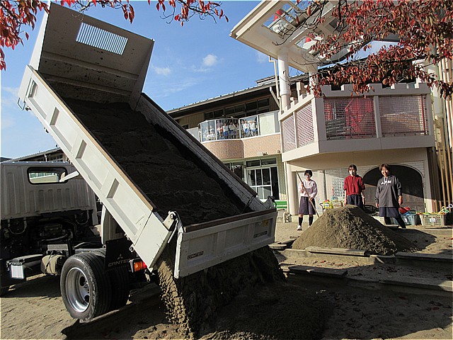 11月7日(金)の午後に砂場に新しい砂を入れました。はくちょうクラブのみんなに手伝ってもらい、砂を平らにならしました。