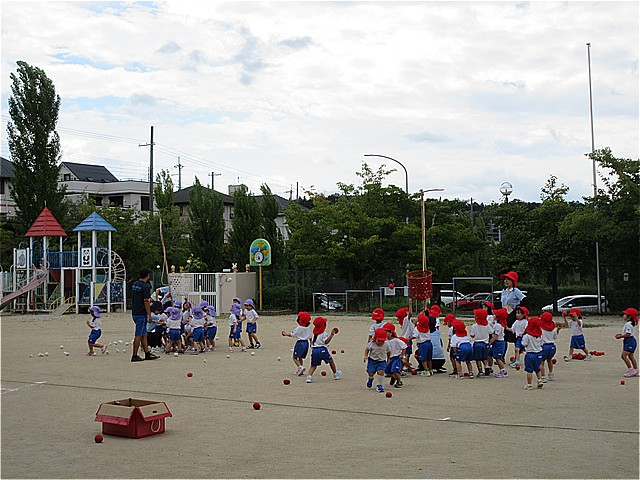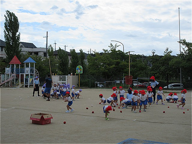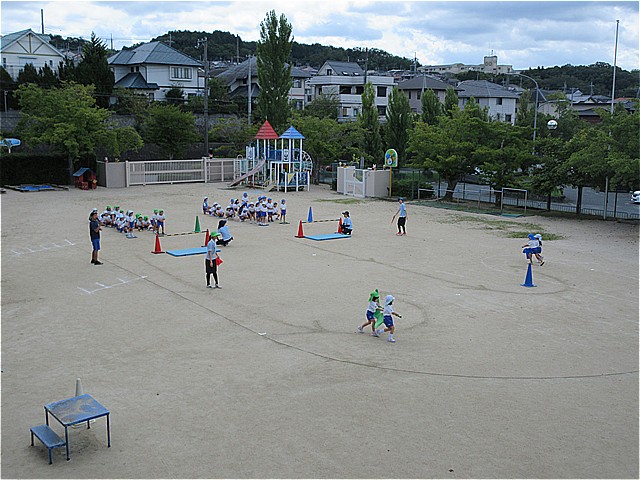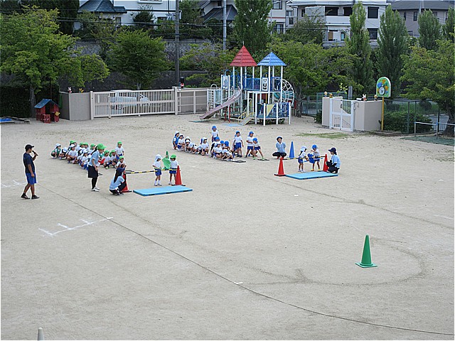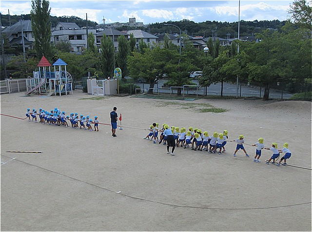 今日は団体演技の練習を初めて園庭で行いました。年少組は「玉入れ」、年中組は「綱引き」そして年長組は2人一組で棒にクラスカラーの服を引っかけて競争します。一つ一つの動きを大切にしながら、どんどん成長していく子どもたちの様子を教員一同、しっかりと見守っていきたいと思います。今後もブログで練習の様子を紹介していきます。
