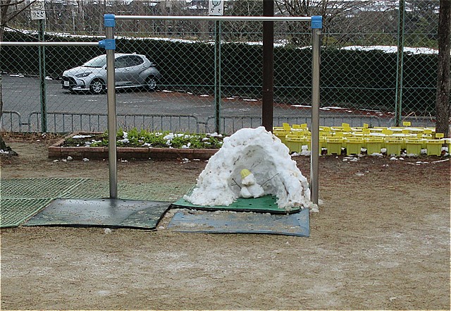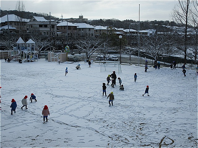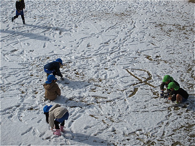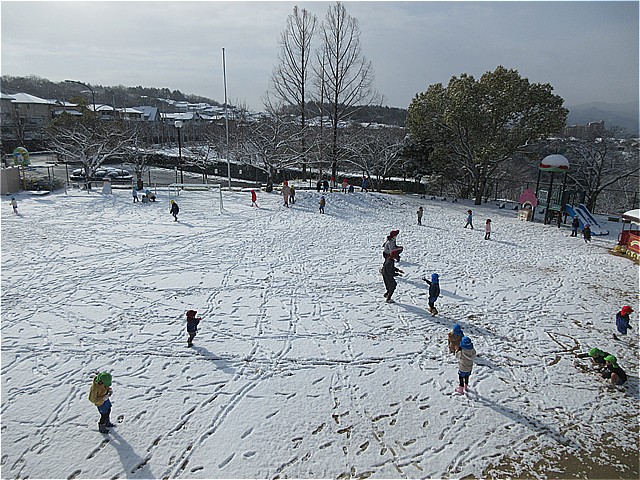 今日は、阪急バスが運休のため(基本、近隣の阪急路線バスが運休の場合は、園バスは運行しません)自由登園日となりました。登園した美山っ子は、雪が積もっている園庭でいっぱい遊びました。