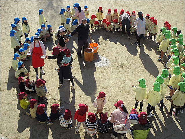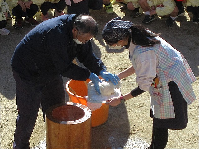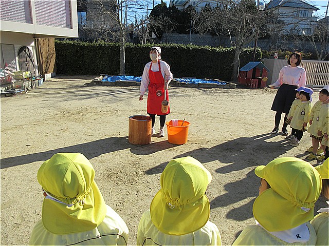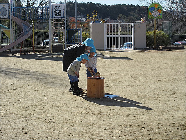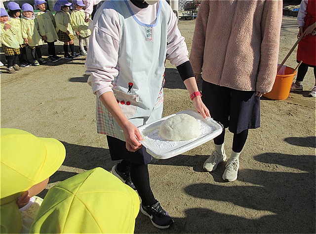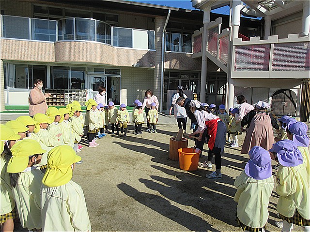 終業式の後は餅つきを見学しました。お餅を食べることはできませんが、子どもたちは興味深そうに見学していました。できたお餅は、大きな鏡餅にして園に飾ります。