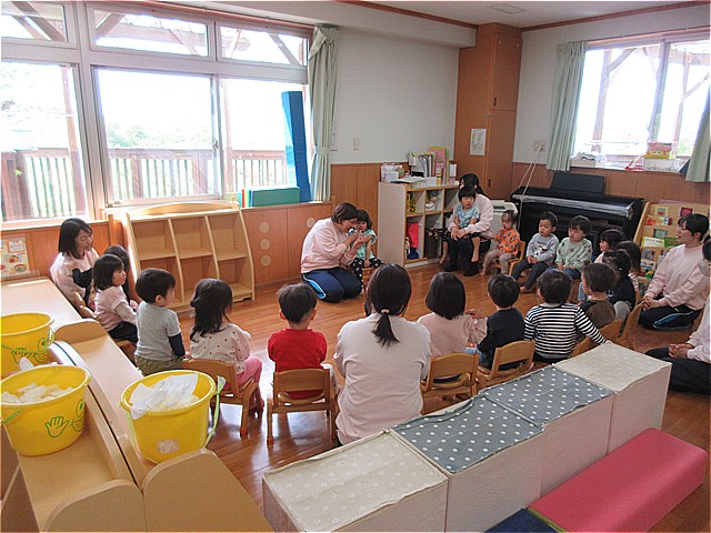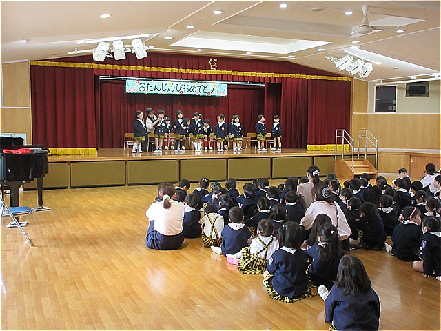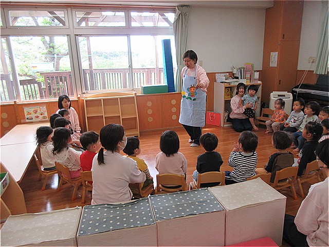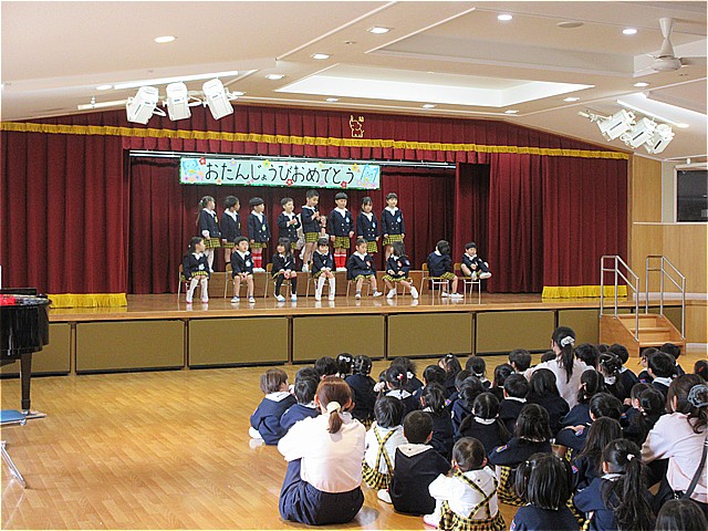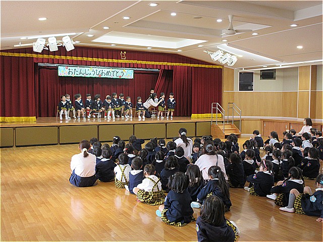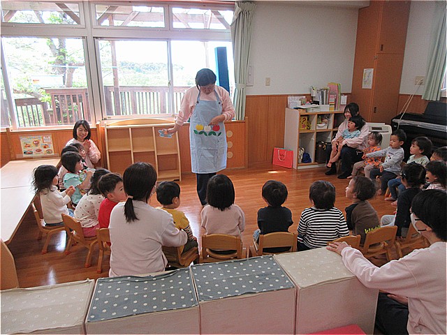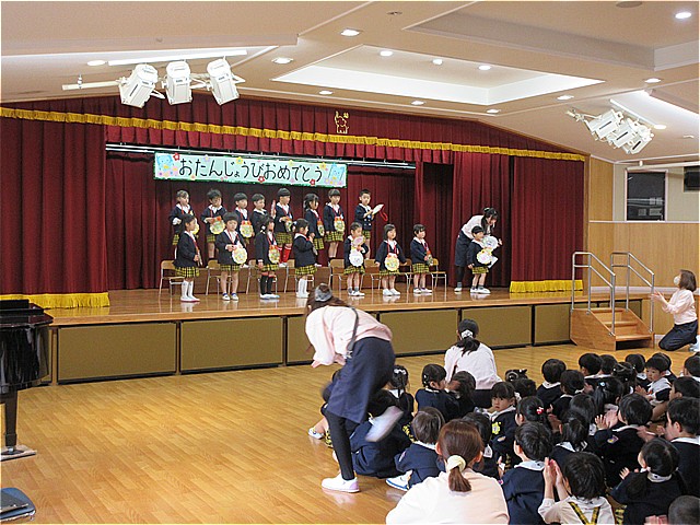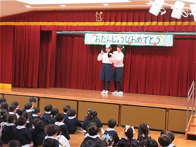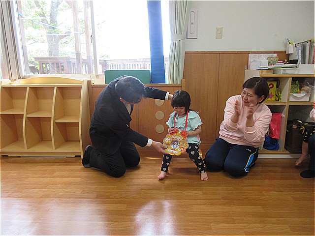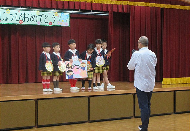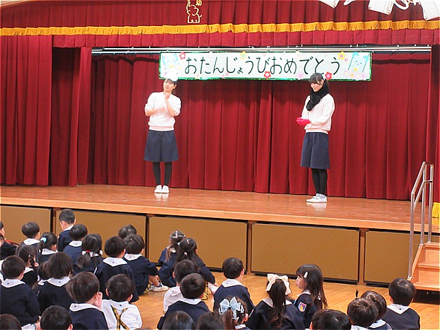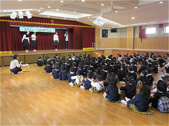 4月生まれのお友だちの お誕生会を開催しました。保育園は各部屋で、幼稚園は、保護者の皆様を招待して全員で集まって遊戯室で行いました。お誕生日カードをプレゼントしてもらい、お友だちから拍手と言葉でお祝いをしてもらいました。最後に先生からの出し物をみんなで楽しみました。幼稚園の給食にはお祝いのデザートが出ました。4月生まれの皆さんおめでとうございます。
