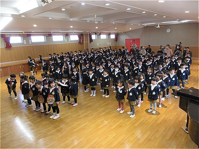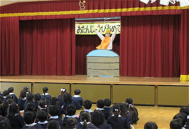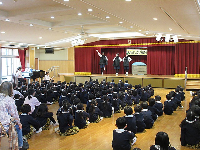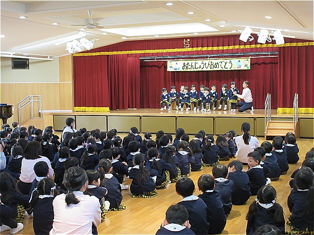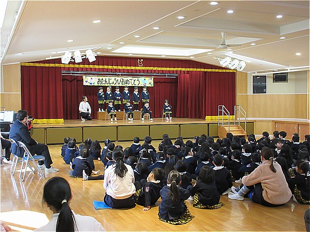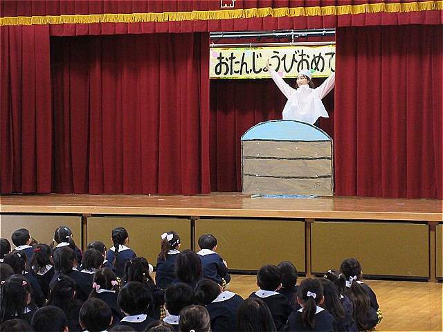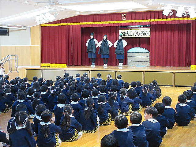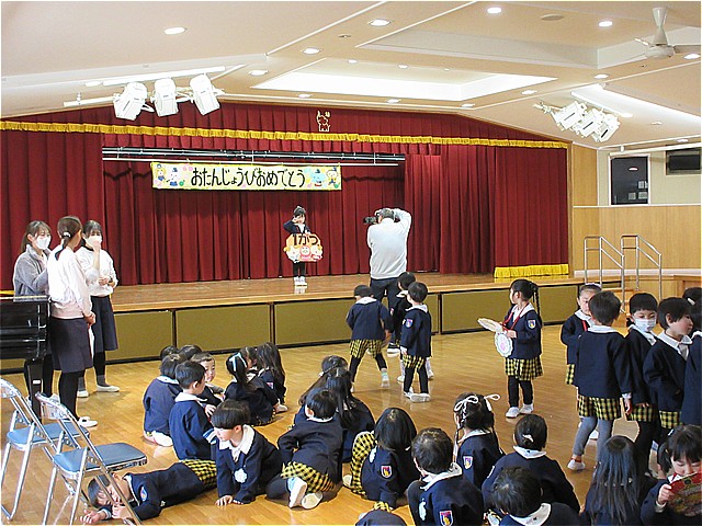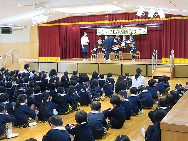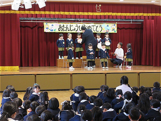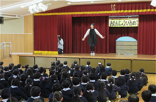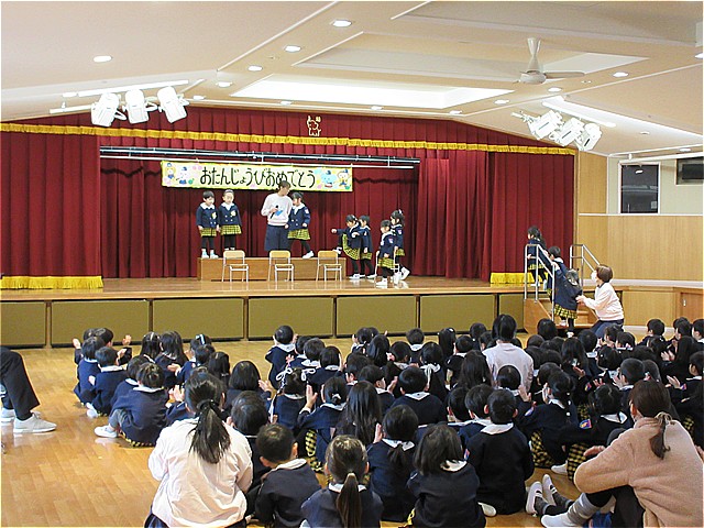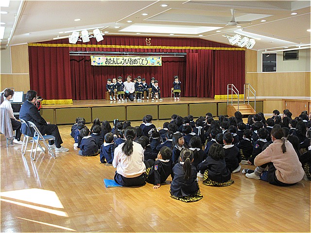 1月生まれのお友だちのお誕生会を開催しました。(保育園は1月生まれのお友だちがいませんでした。)幼稚園は遊戯室で保護者の皆さんを招待して開催しました。理事長先生からお誕生日カードをプレゼントしてもらい、お友だちから拍手と言葉のプレゼントをもらいました。先生たちからは劇のプレゼントがありました。幼稚園の給食にはお祝いのケーキが出ました。1月生まれの皆さんおめでとうございます。