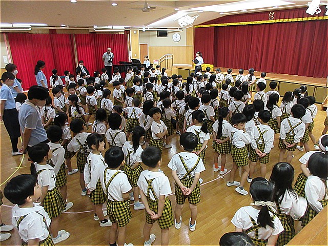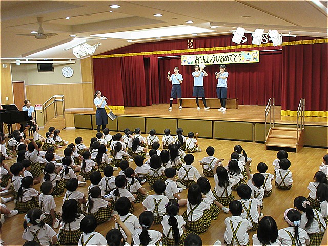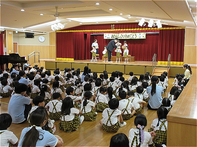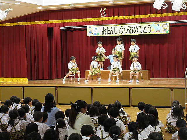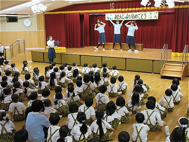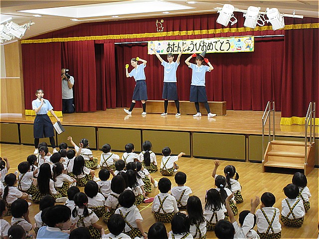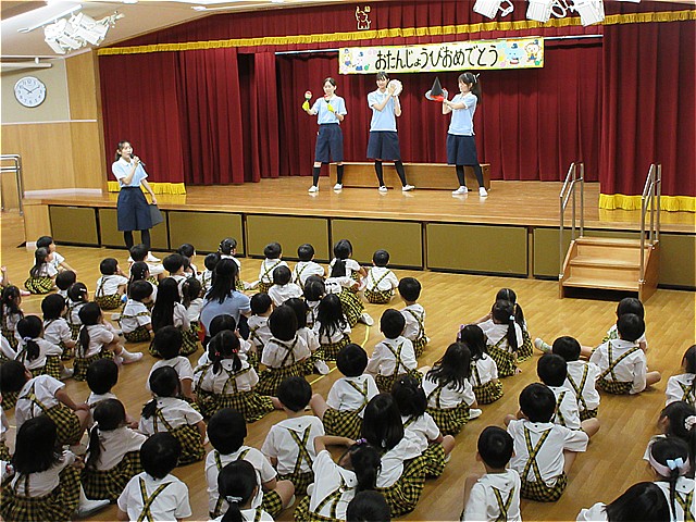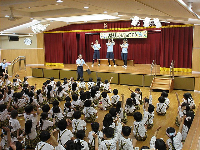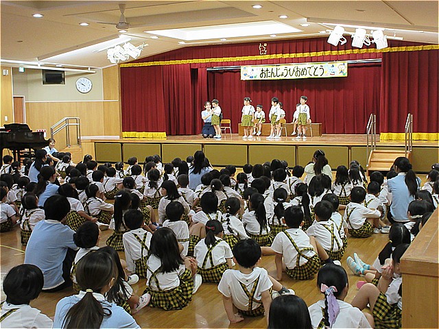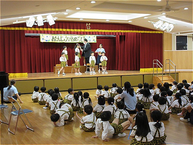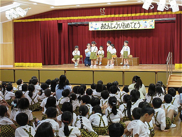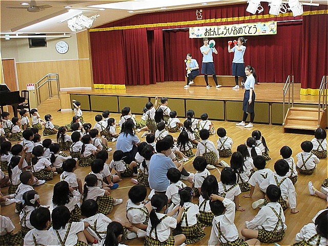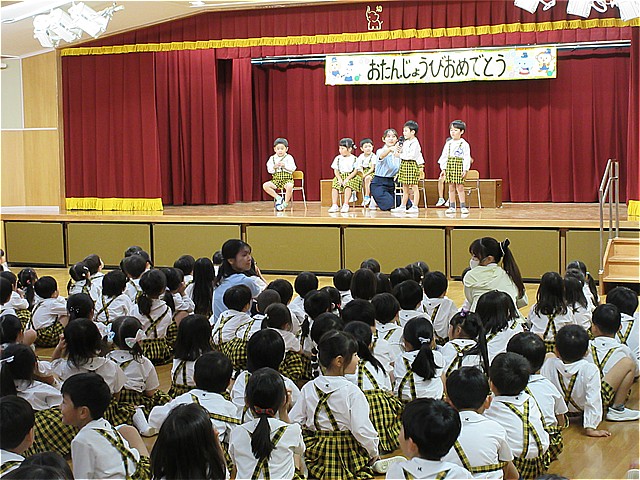 10月生まれのお友だちのお誕生会を開催しました。理事長先生からお誕生日カードをプレゼントしてもらい、お友だちから拍手と言葉のプレゼントをもらいました。幼稚園の給食にはお祝いのケーキが出ました。10月生まれの皆さんおめでとうございます。