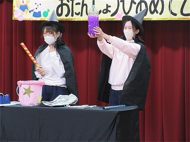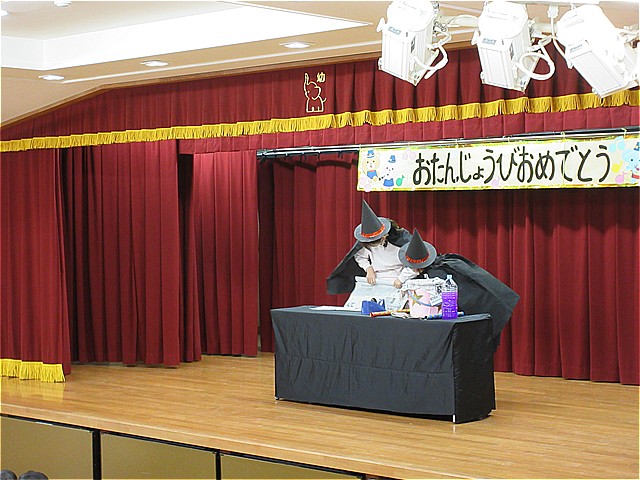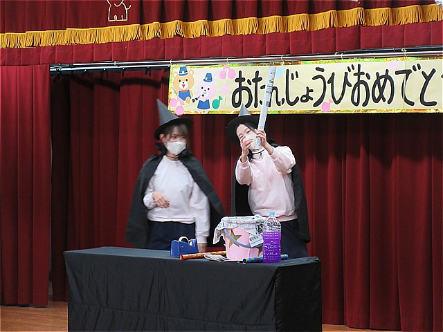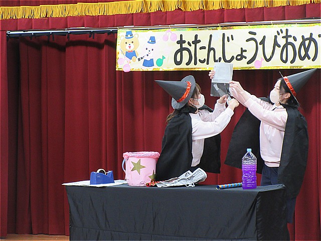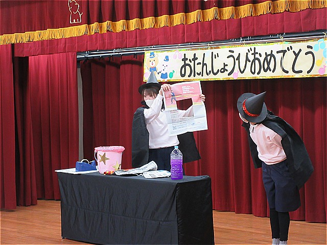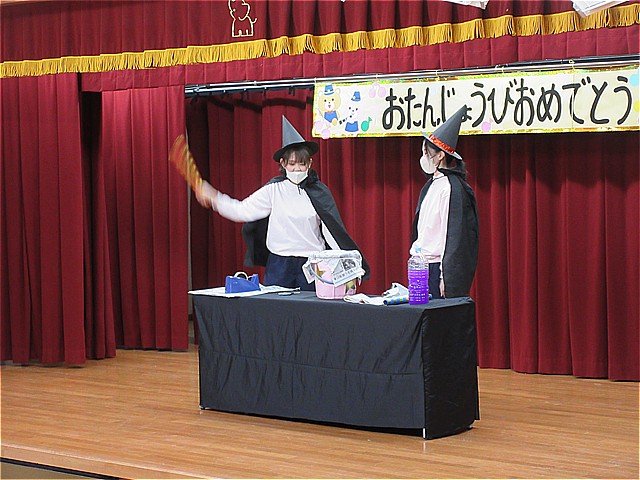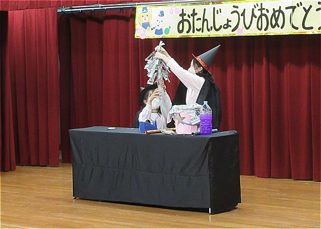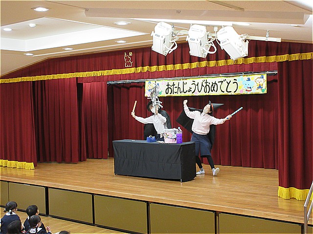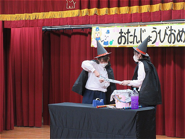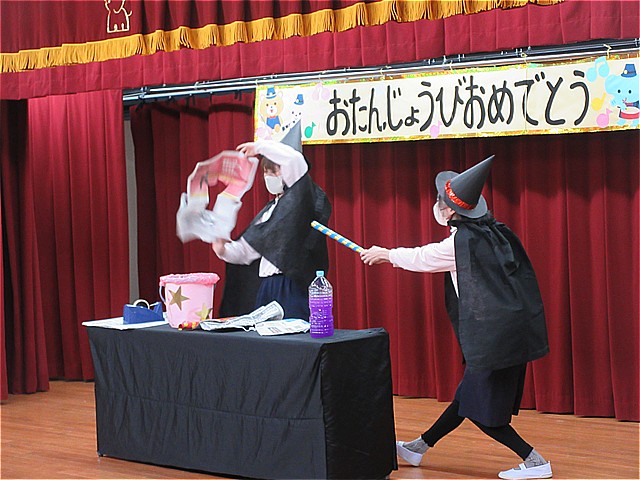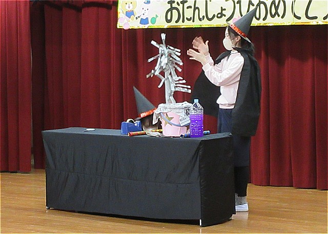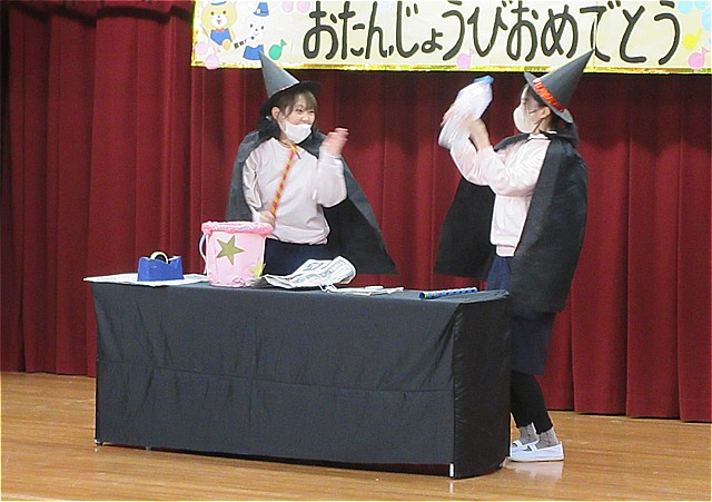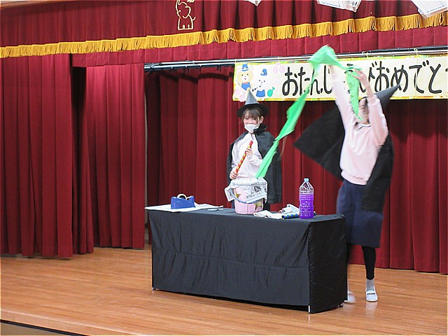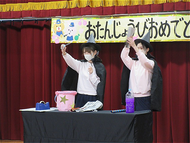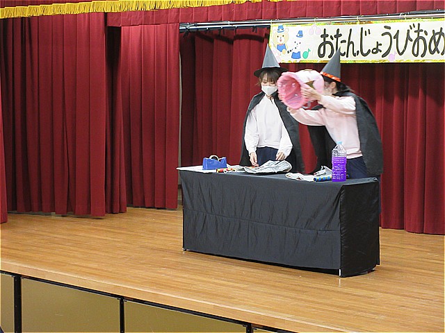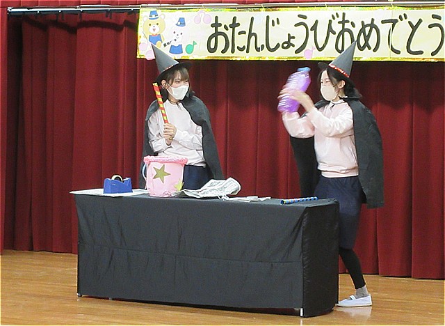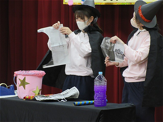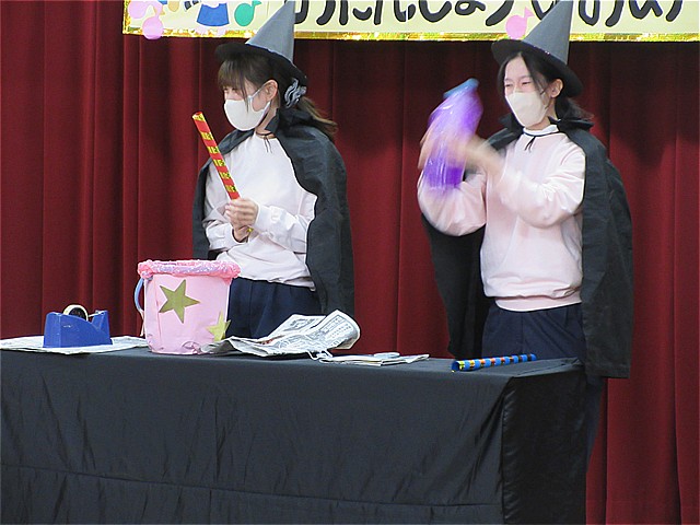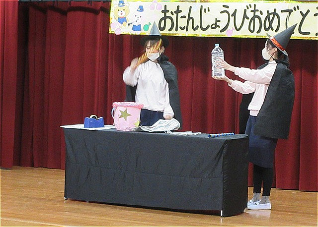 先生からの出し物「マジックショー」です。(教職員の出し物は、毎回教職員で検討し、アイデアを出し合い決定します。)